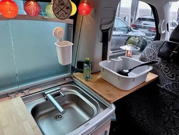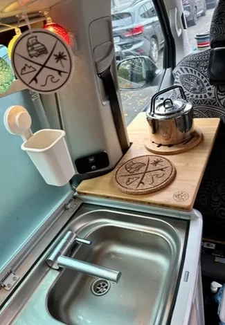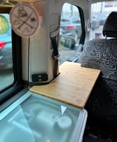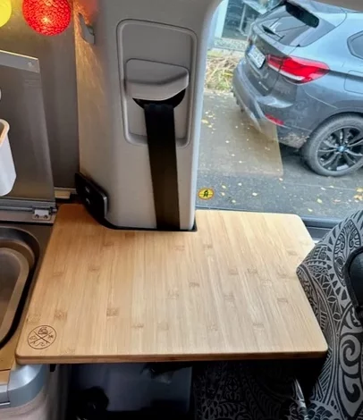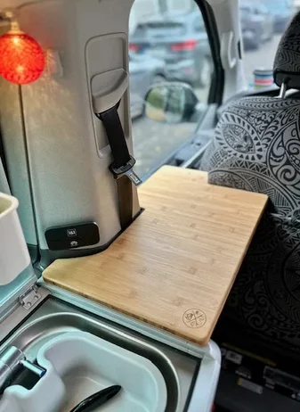 La Extensión de Cocina California es el accesorio ideal para ampliar el espacio de trabajo en tu furgoneta sin modificar nada del interior. Fresada con precisión para un ajuste perfecto, se coloca entre el respaldo del asiento del conductor y: