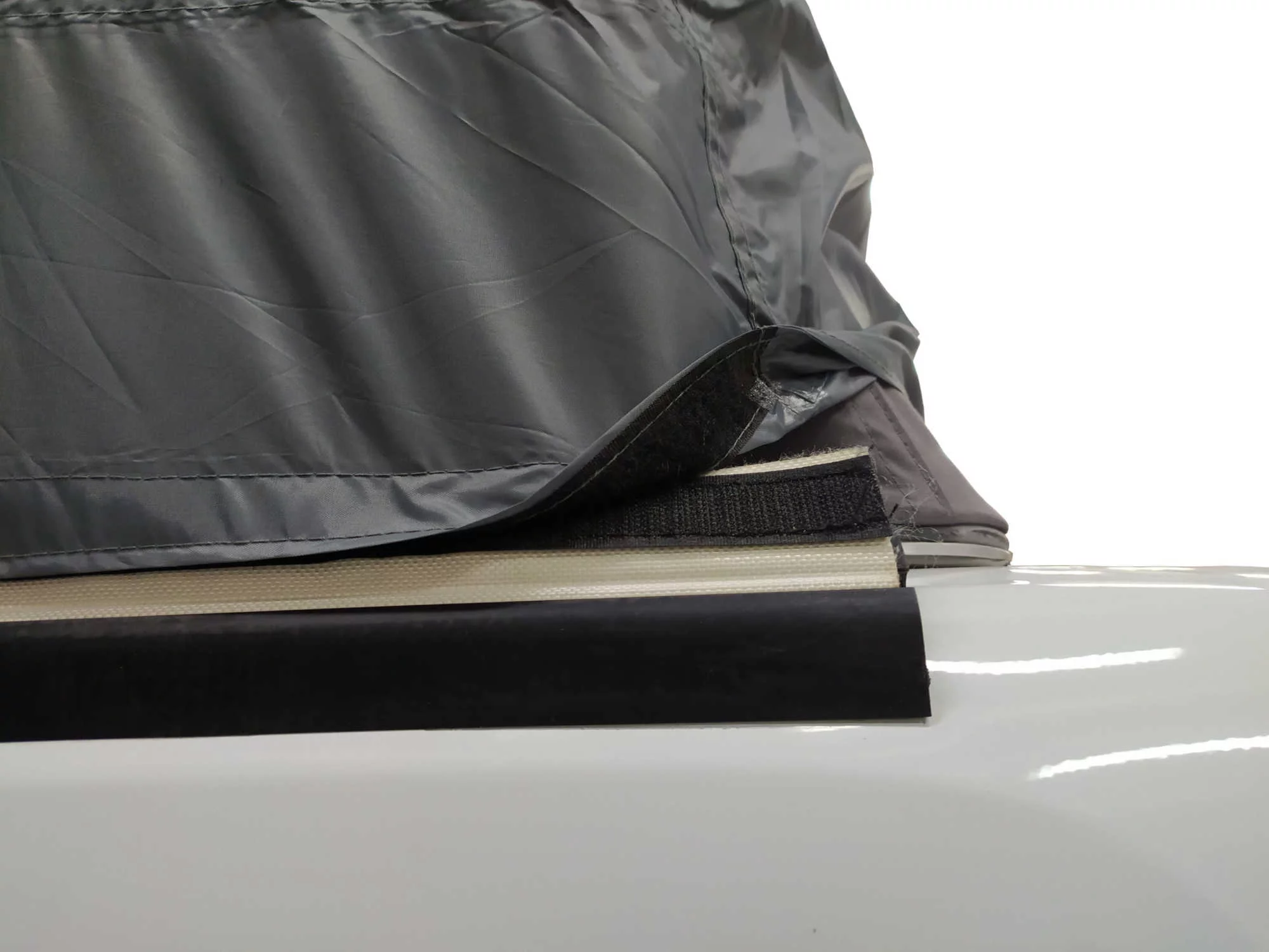 NOTA: En caso de llevar toldo lateral, puedes cortar a medida 2 piezas de bordón para colocar en los tramos de guía libre que quedan delante y detrás del toldo. En todo caso, el perímetro inferior de la funda dispone de varios ollaos metálicos por si prefieres sujetarla con gomas elásticas, cuerdas, imanes o ventosas (no suministrados).