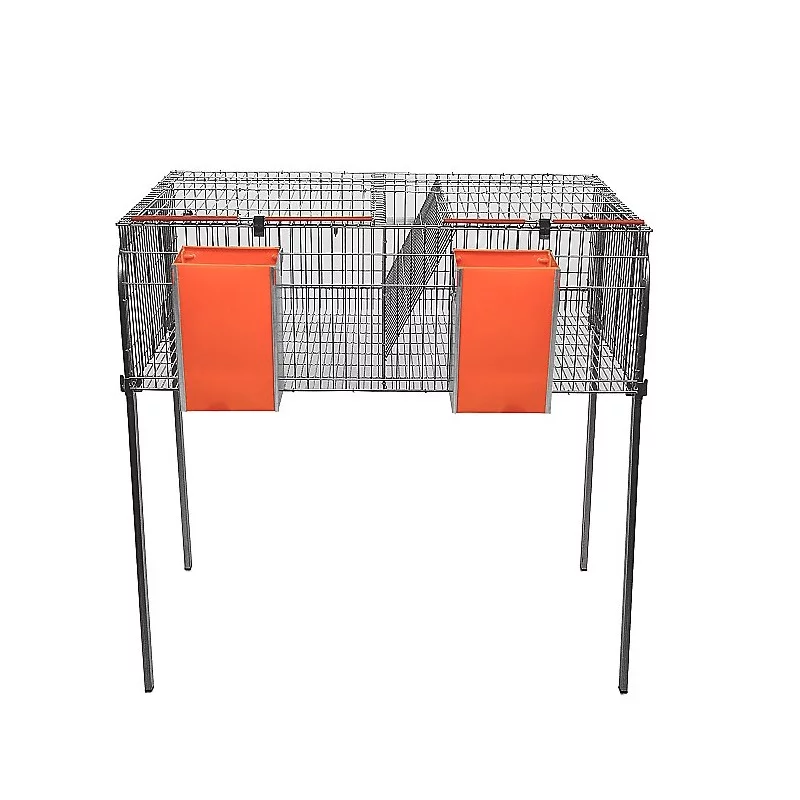 Jaula para cría de Conejos y otros roedores fabricada en metal. Cuenta con 2 departamentos para conejos en 1 solo piso y es ideal para la cría y engorde de conejos. Incluye comederos de 2 bocas y forrajera. También incluye bebederos a elegir entre tipo chupete (con conexión y tubería de PVC) o tipo bebedero de cazoleta con botella. Fabricada en España.