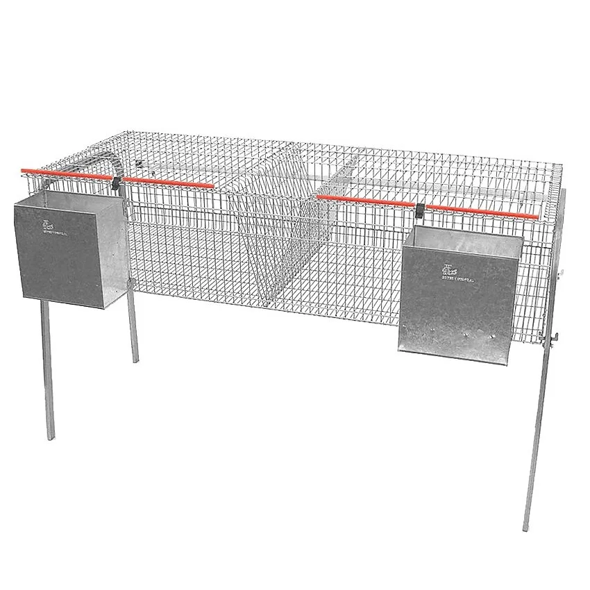 Jaula para engorde de Conejos y otros roedores fabricada en metal. Cuenta con 2 departamentos de engorde (caracterizados por ser de gran tamaño) para conejos en 1 solo piso. Incluye comederos de 3 bocas en cada departamento y forrajera. También incluye bebederos a elegir entre tipo chupete (con conexión y tubería de PVC) o tipo cazoleta con botella. Fabricada en España.