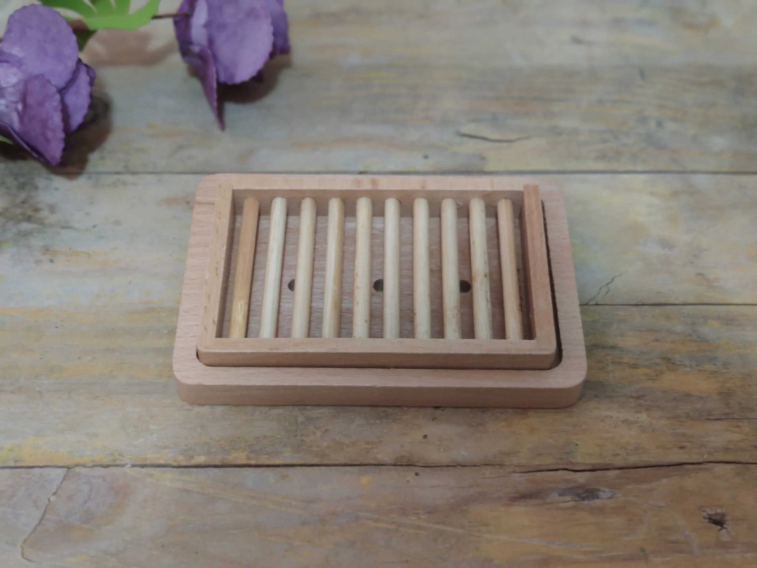 Jabonera de madera de haya y bambú. Perfecta para que tu cosmética sólida se conserven en buen estado, ya que favorece que se sequen al aire y evita que acumule agua.