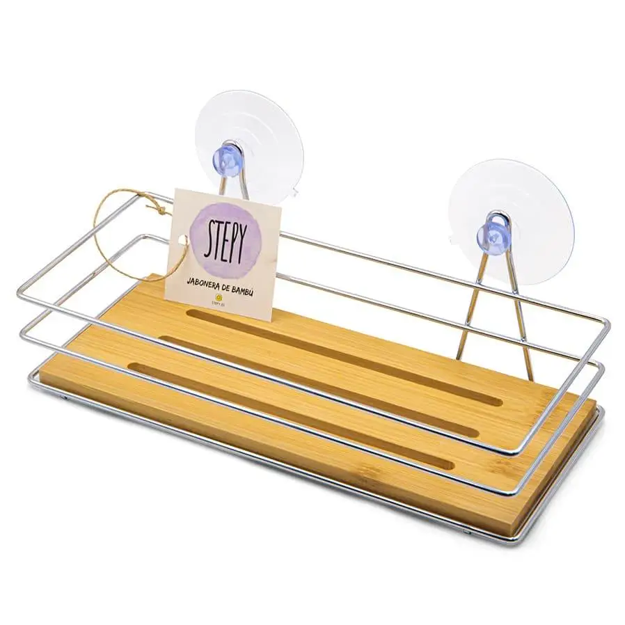 - Jabonera de bambú y metal cromado, con ventosas (que puedes cambiar por tornillos).