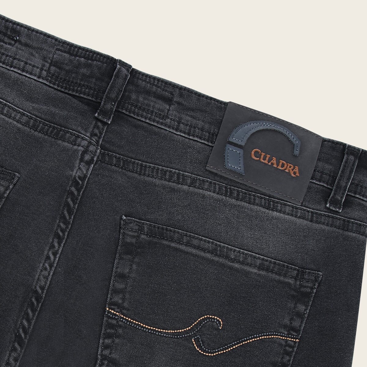 Jeans Cuadra para caballero. Presenta aplicación de metálica sobre piel de bovino en la parte trasera logotipo Cuadra.
