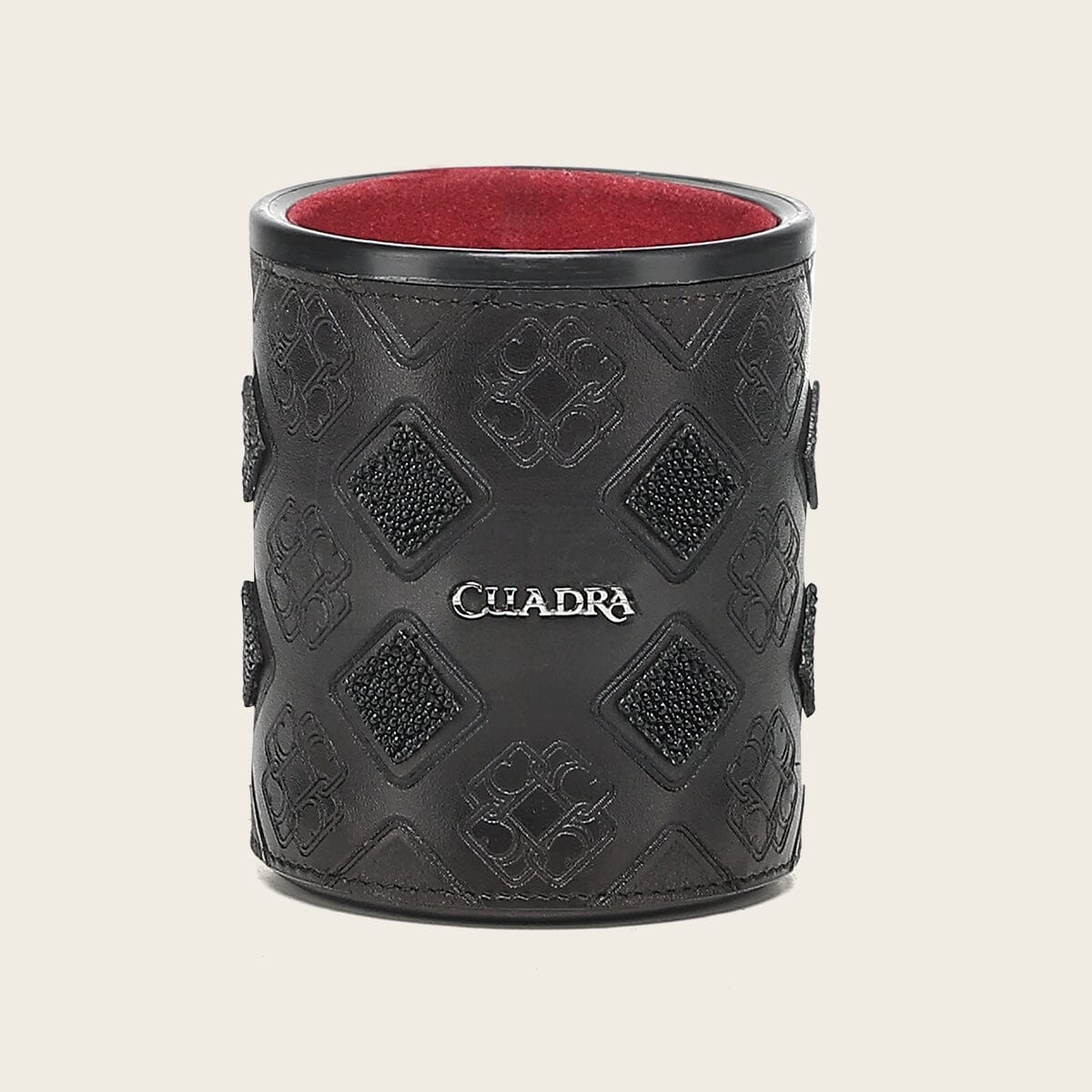 Juego de cubilete Cuadra en piel genuina de mantarraya y piel de bovino. La parte externa presenta grabado láser sobre la piel de bovino en motivos geométricos y monograma Cuadra, con aplicaciones en piel genuina de mantarraya. Con aplicación metálica del logotipo Cuadra. Incluye 5 dados uno de ellos personalizado con el monograma de la marca.