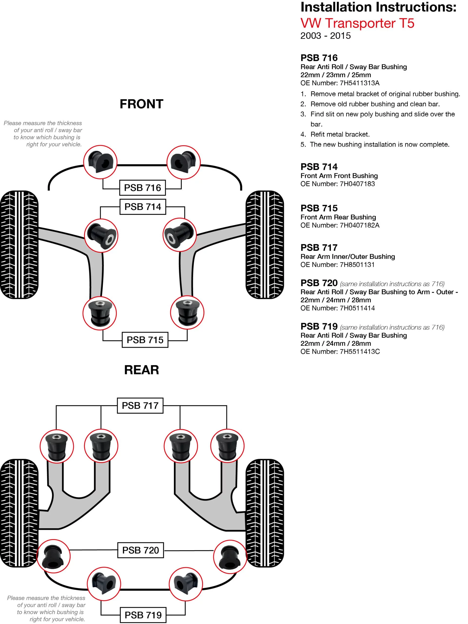Kit completo de silentblocks Del/Tras de poliuretano para VW Transporter T5/T6 03-20. Incluye silentblocks de 23/24 mm para las barras de torsión delantera/trasera.