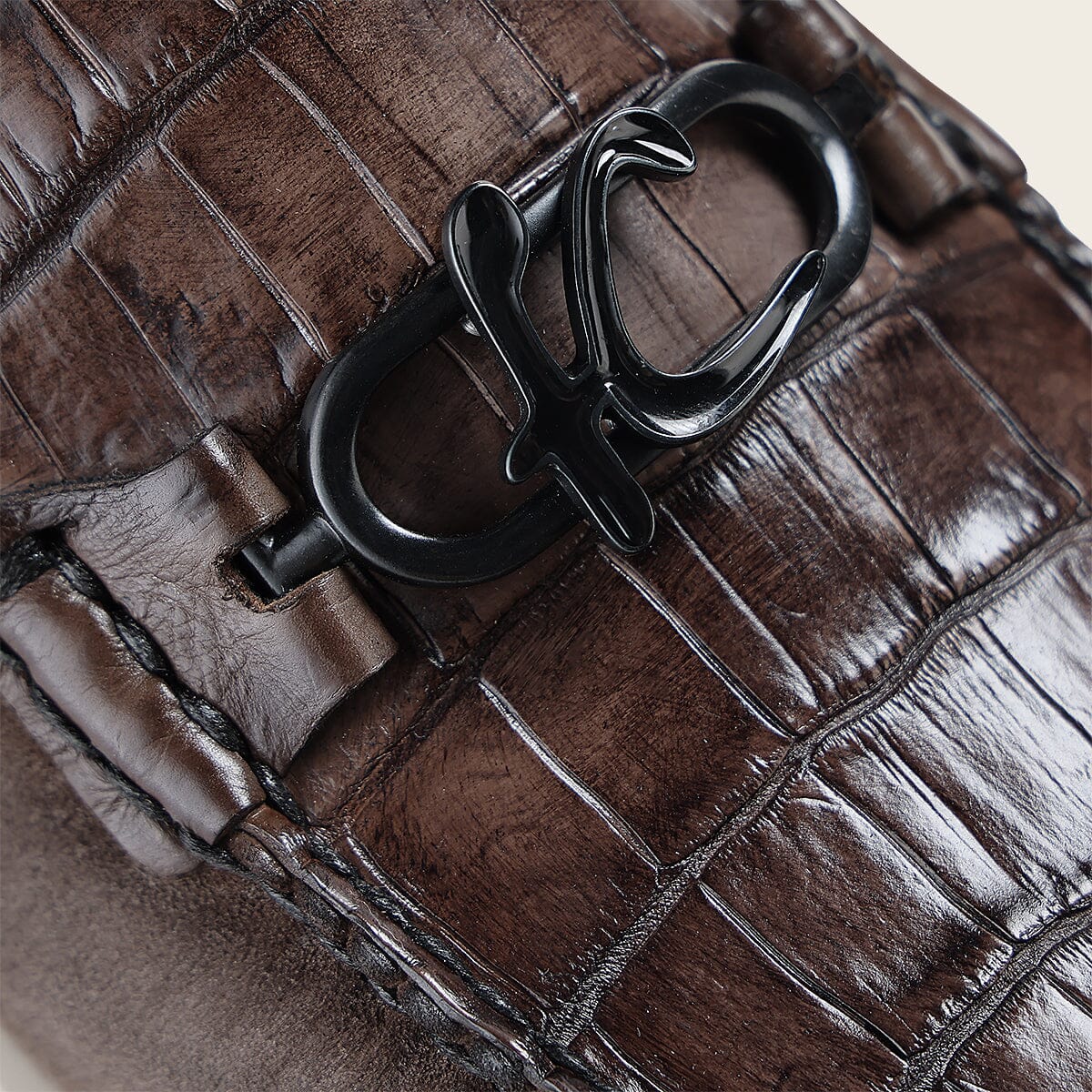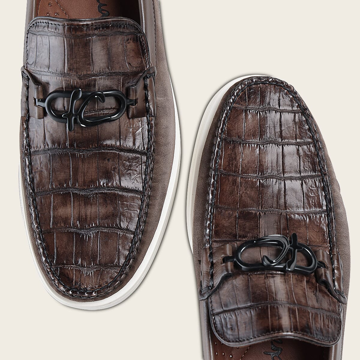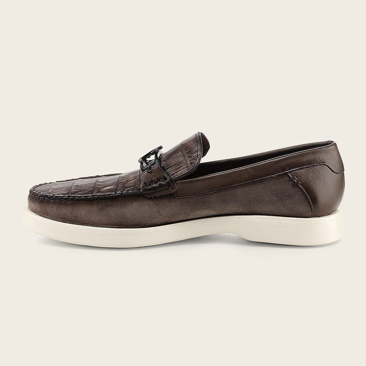 Zapato Loafer para caballero en piel genuina de nilóticus y piel de becerro con acabado nobuk. Presenta arnés con herraje del monograma Franco Cuadra, contraste de texturas y sombreado a mano. Con forro de napa reconocido por su suavidad y confort. Suela de EVA caracterizada por brindar comodidad y ligereza.