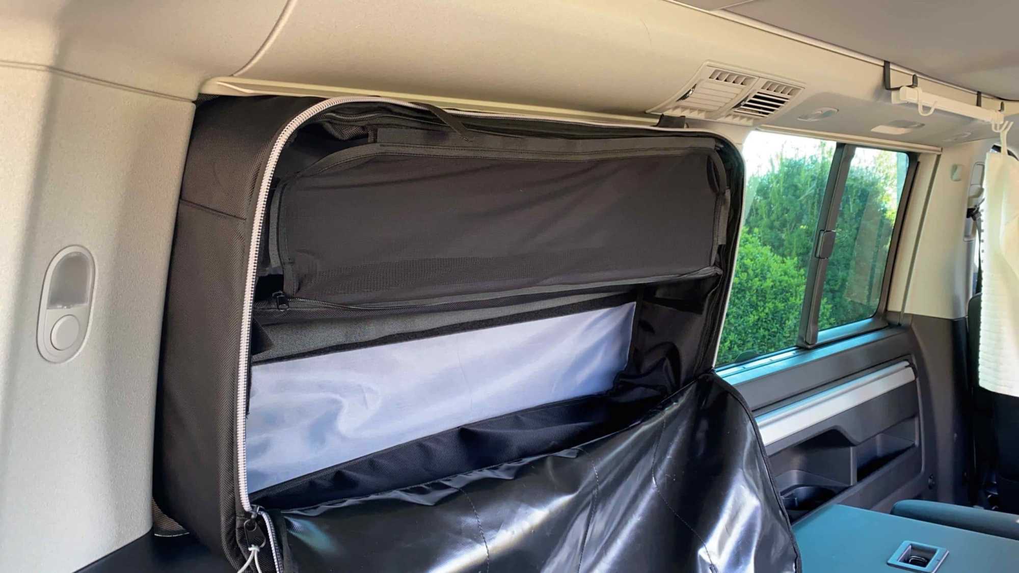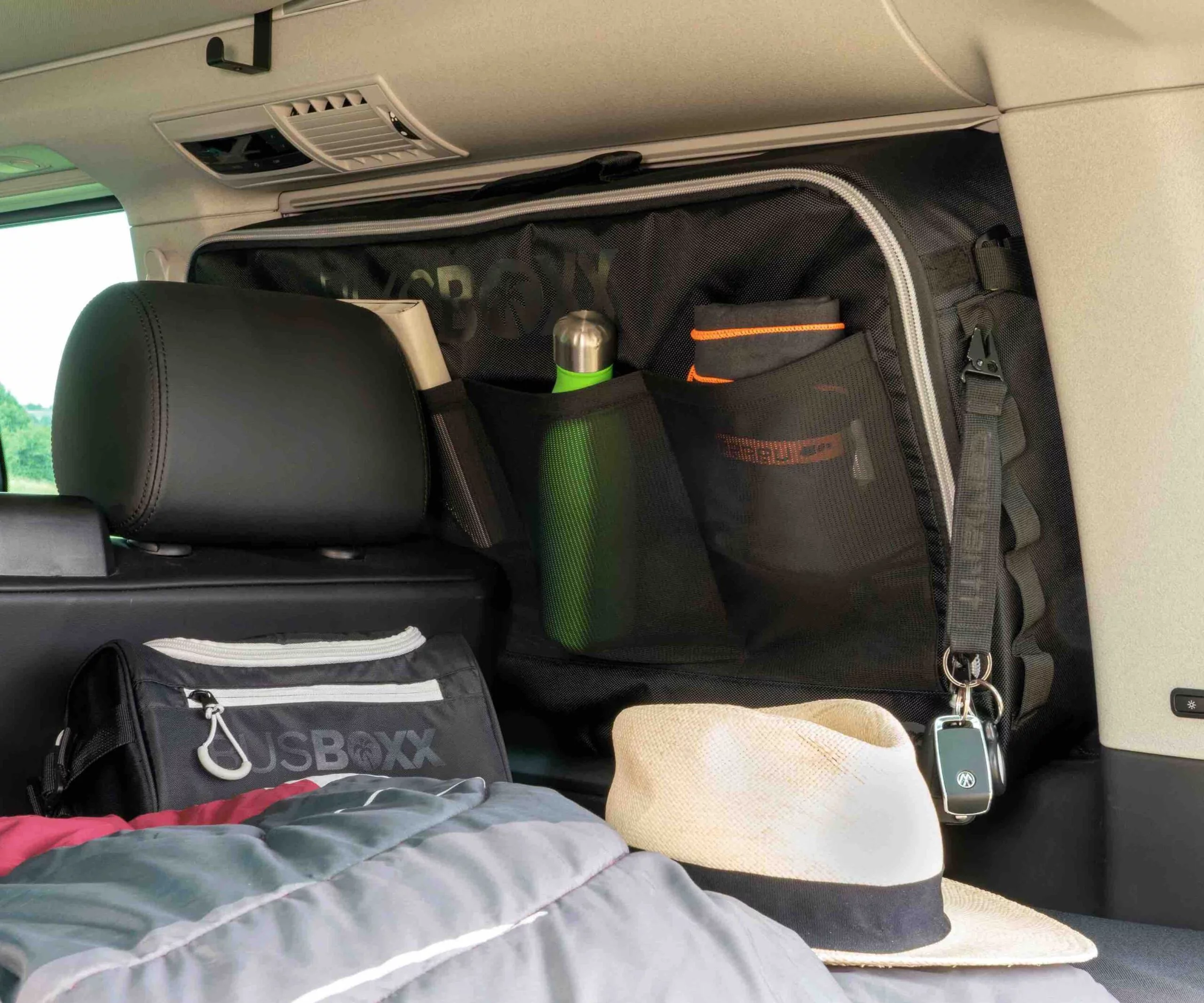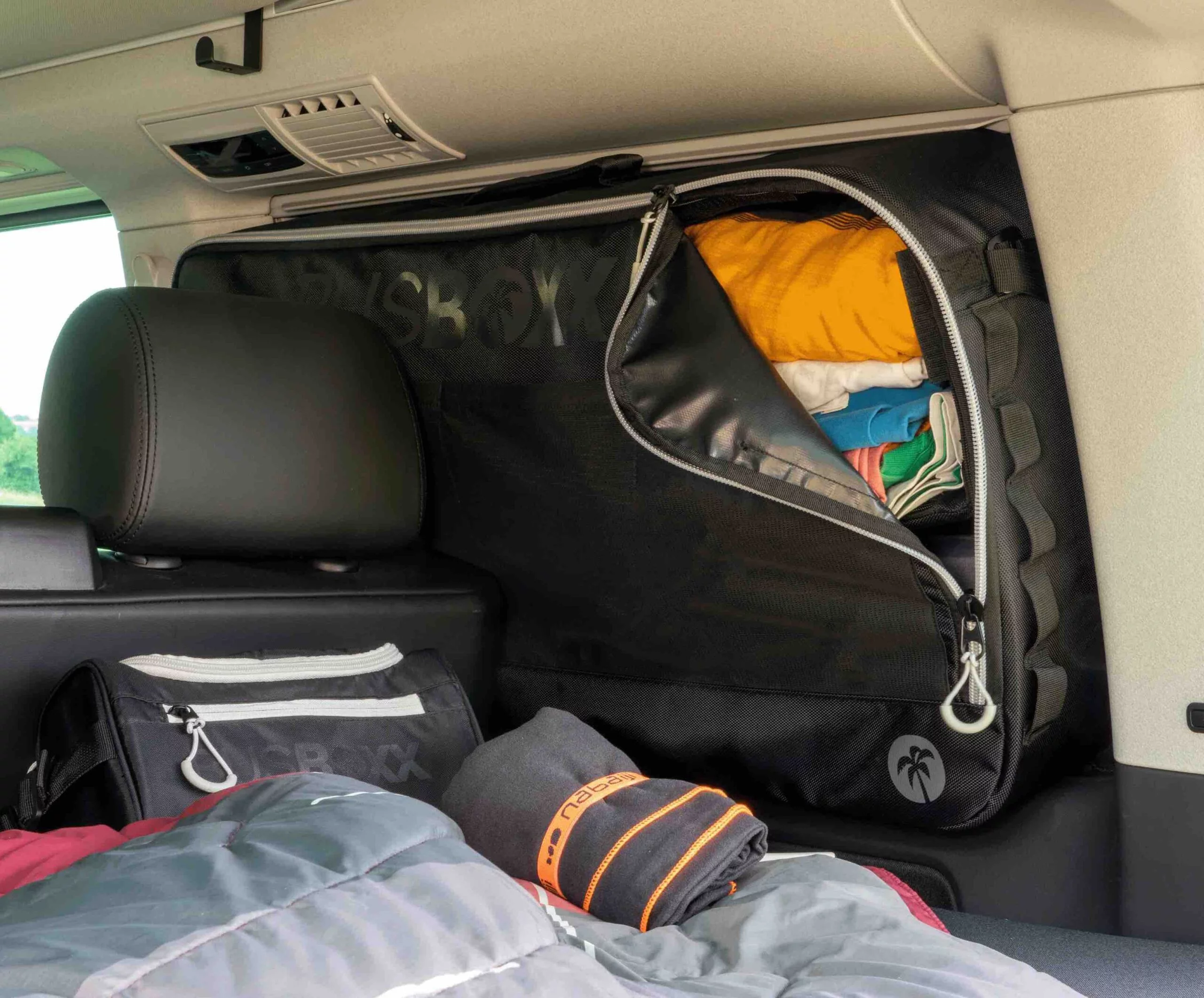 Imagina llegar a tu destino y tener todo organizado al instante. Con la WindowBOXX, aprovechas el espacio de las ventanas traseras de tu furgoneta camper para almacenar lo esencial sin perder comodidad ni visibilidad. Diseñada para modelos California Beach, Ocean, Coast y Multivan, esta solución inteligente se instala fácilmente mediante una plancha que se introduce en el revestimiento de la ventana, sin necesidad de herramientas.