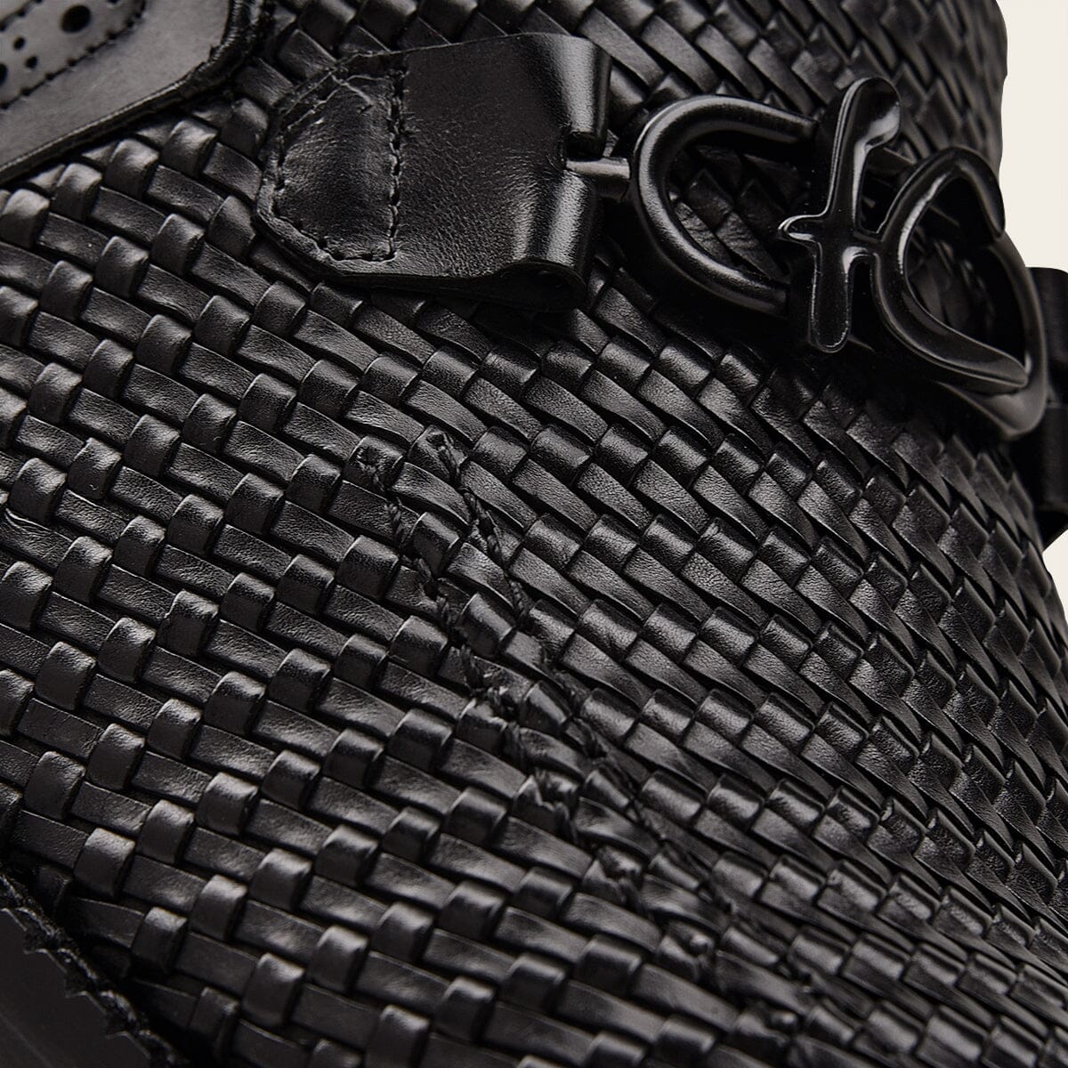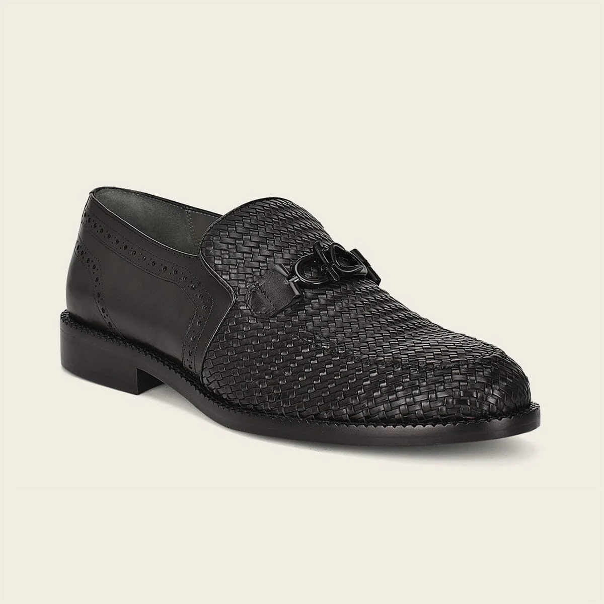 Mocasín slip on para caballero en piel de bovino. Diseño entretejido con aplicación metálica de monograma Franco Cuadra al frente. Con suela de cuero con injerto de TPU.