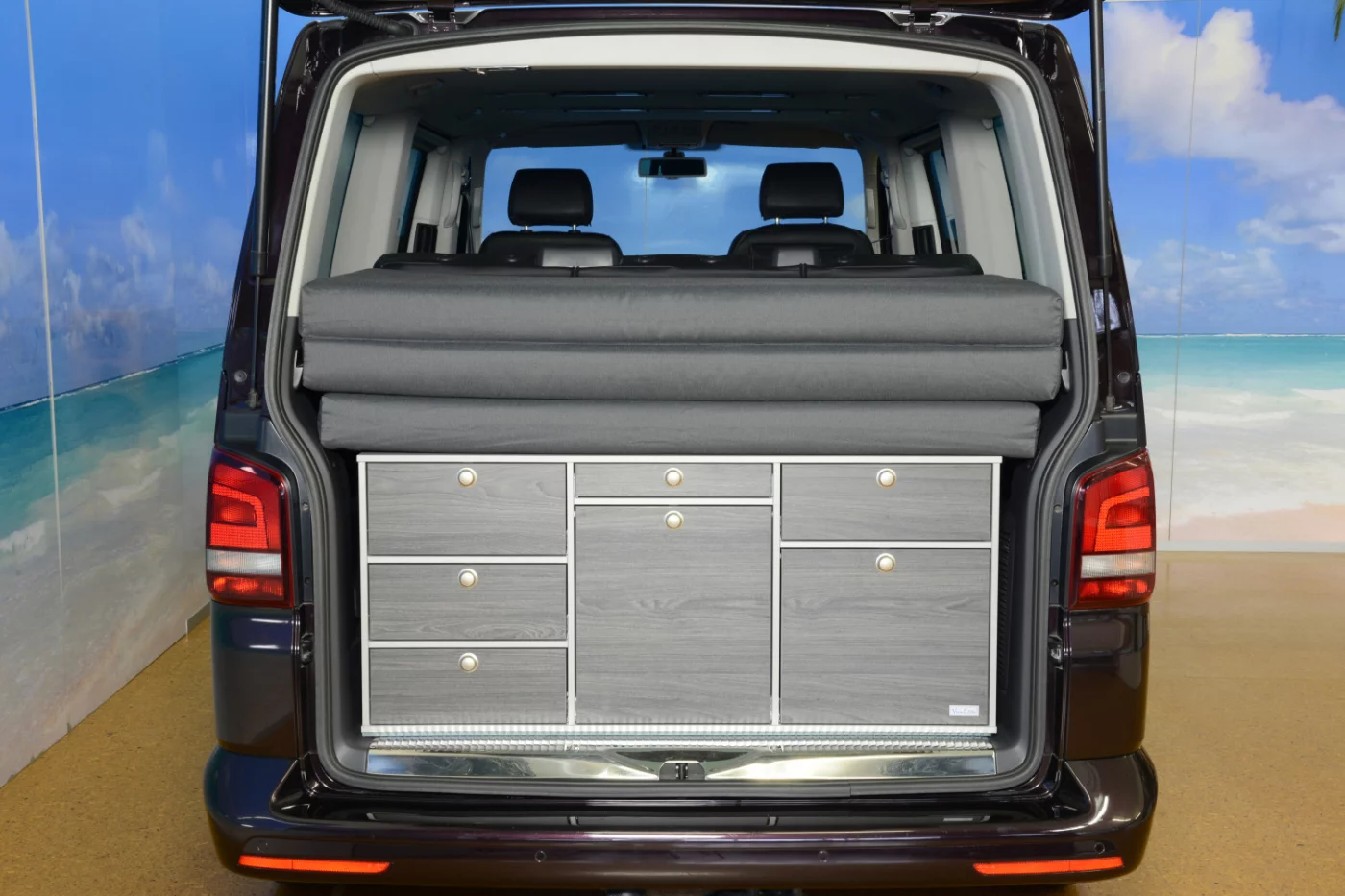 - Módulos a medida en altura adaptados a cada modelo de furgoneta: Multivan (53 cm), Caravelle (56 cm) o California Beach (A3 53 cm / A2 42,5 cm)