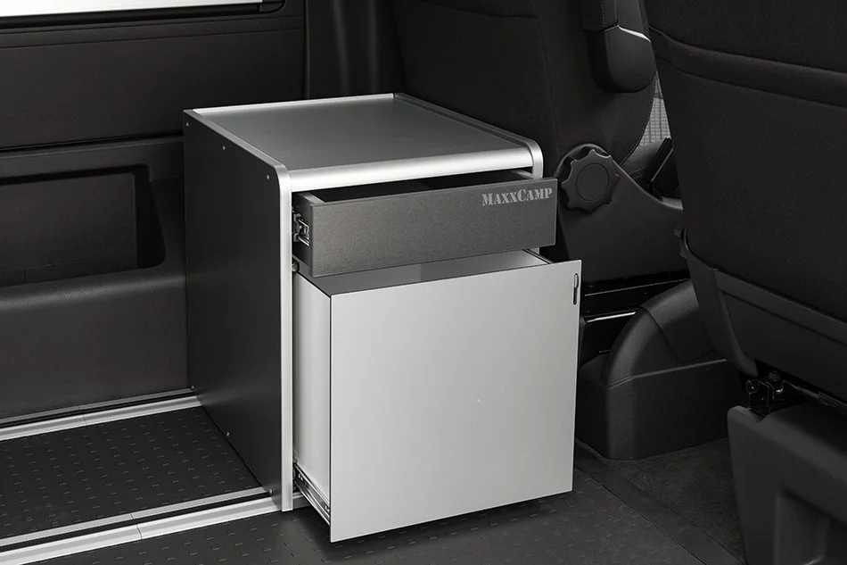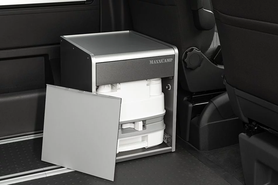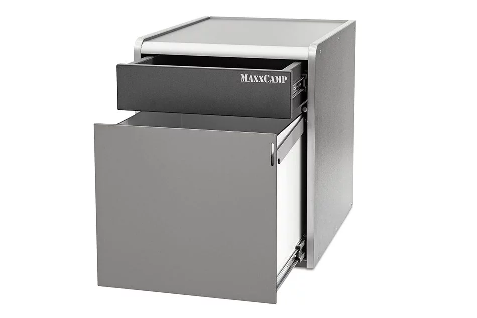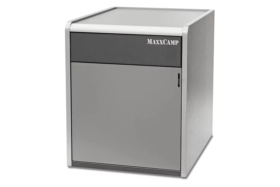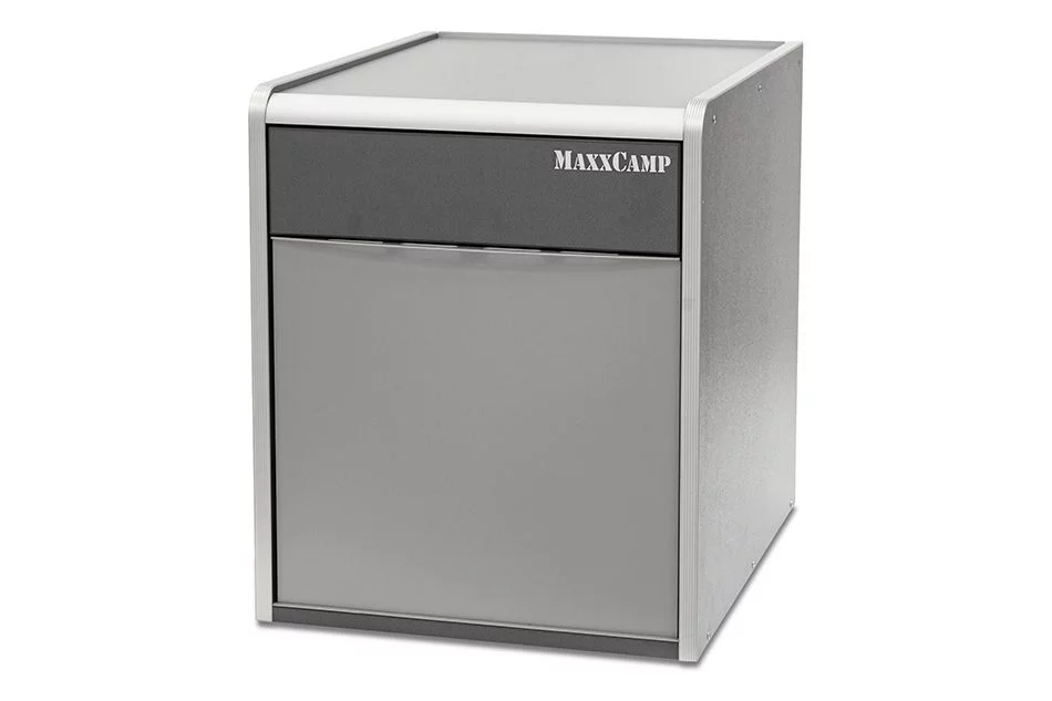 - Módulo de doble uso: si se retira el cajón inferior, podemos obtener espacio para guardar el inodoro portatil Thedford 335. El frontal se cierra con una tapa de cubierta que se incluye de serie.