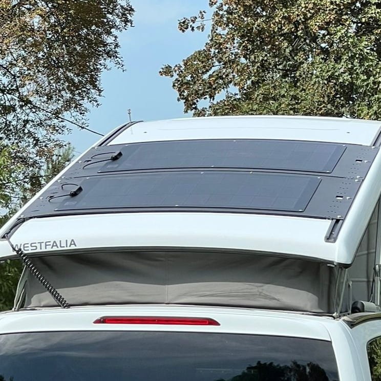 Con placa semiflexible 200 Wp para MB Marco Polo. Montaje sin taladrar, diseño ultrafino, alta eficiencia y control Bluetooth