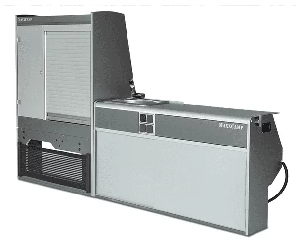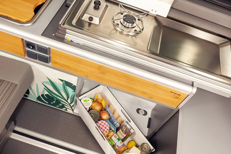 El sistema incorpora fregadero de acero inoxidable, grifo California original, bomba de agua y garrafas de agua limpia y sucia, garantizando un uso sencillo y eficiente durante tus viajes.