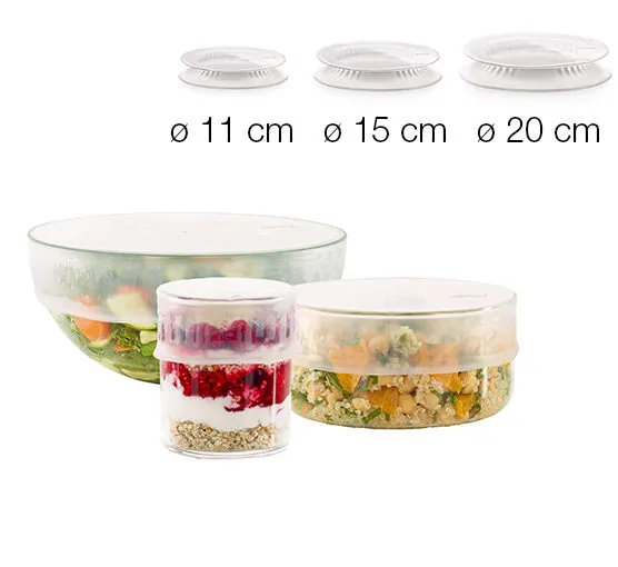 - 1 tapa extensible reutilizable ø 11 cm. Para recipientes de ø 11 cm hasta ø 14 cm.