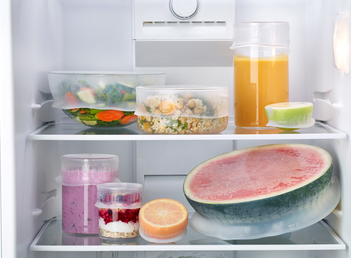 - Tapas extensibles reutilizables que permiten conservar herméticamente los alimentos en la nevera de manera fácil, evitando la contaminación de olores y alargando su frescura.