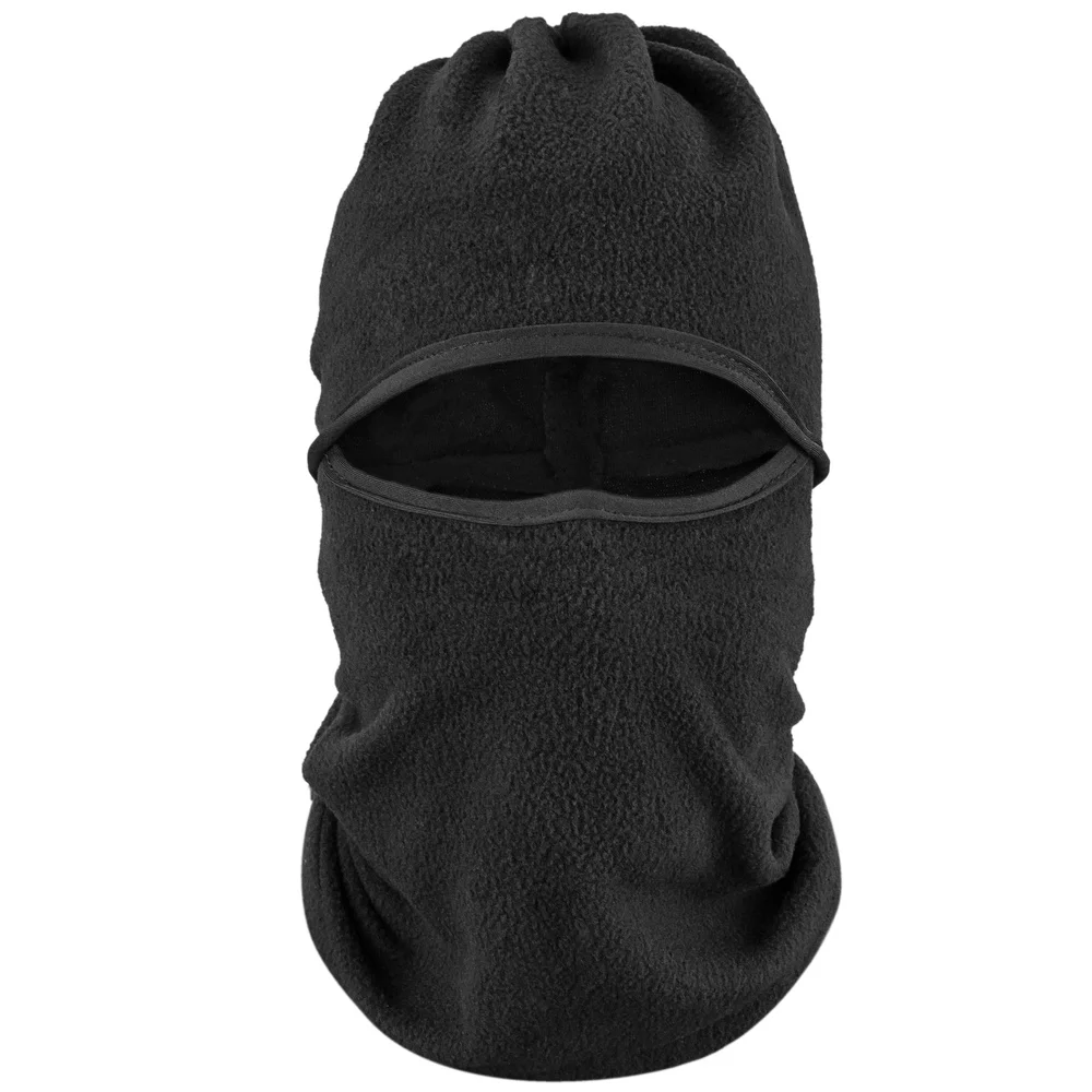 Pasamontañas de tela que cubre la cara y el cuello. Protege del frío y el sol. De doble diseño, pues dispone de una parte para el cuello y la zona por debajo de los ojos, y de otra parte para la zona superior a los ojos. Fabricado en confortable tela de color negro, acolchada y con elevada protección térmica. En uno de los extremos dispone de cuerda para el cierre. Longitud: 440 mm. Ancho: 285 mm.