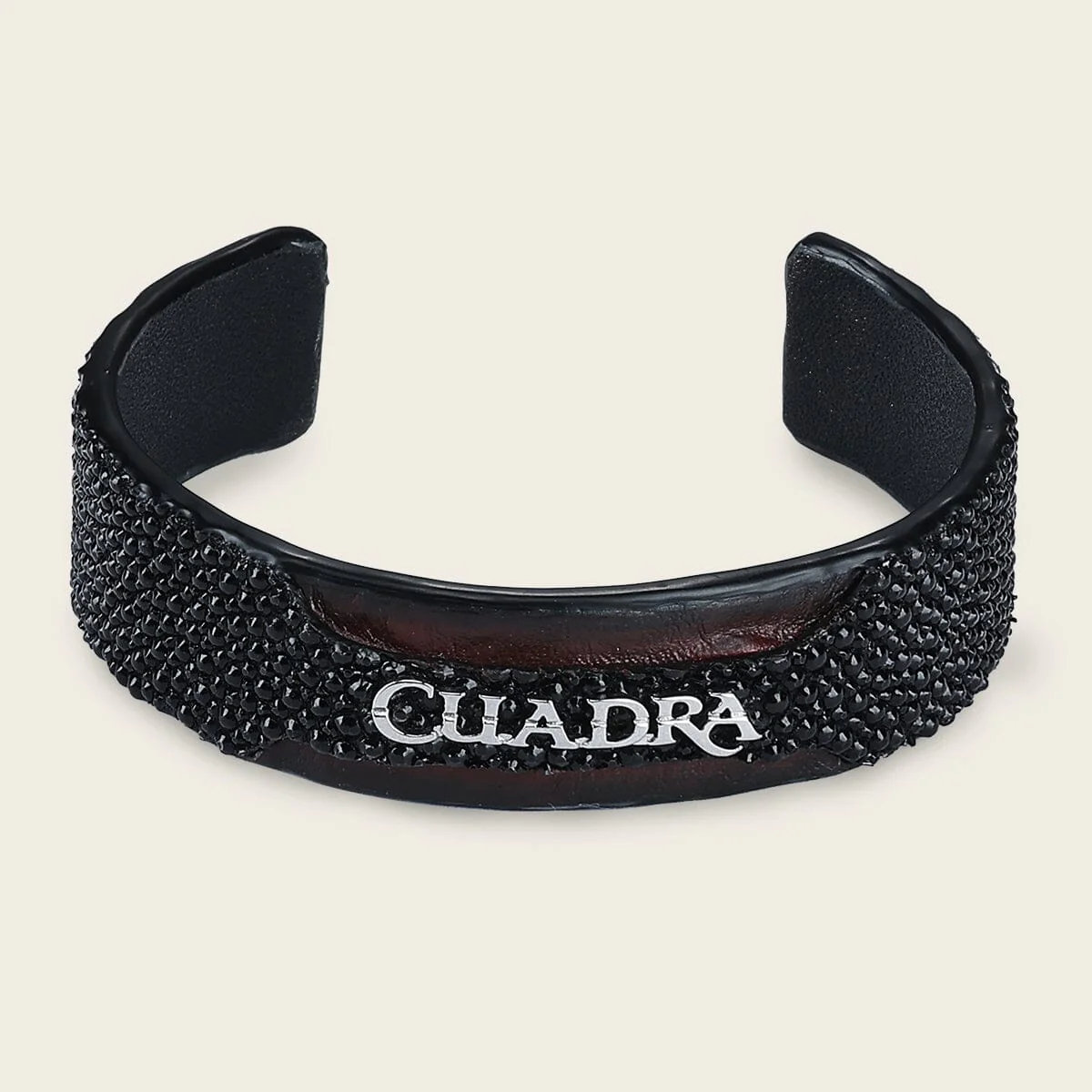 Pulsera ajustable para caballero en piel genuina de mantarraya y piel de bovino. Con componente Cuadra con acabado platino. Diámetro aproximado de 6.3 cm y altura aproximada de 1.7 cm.