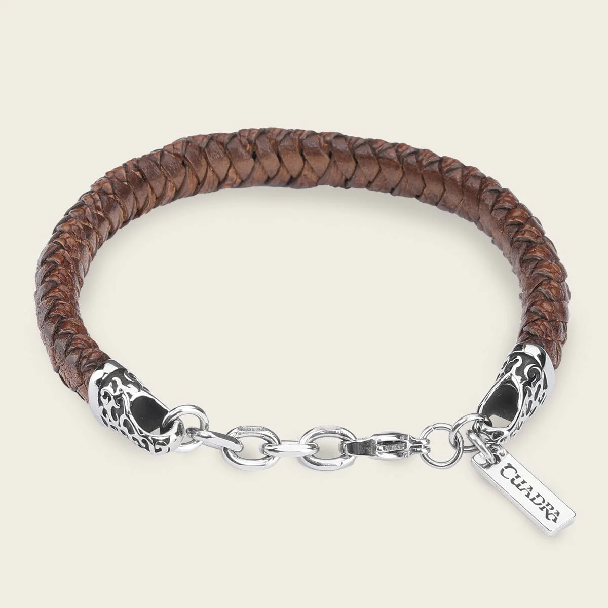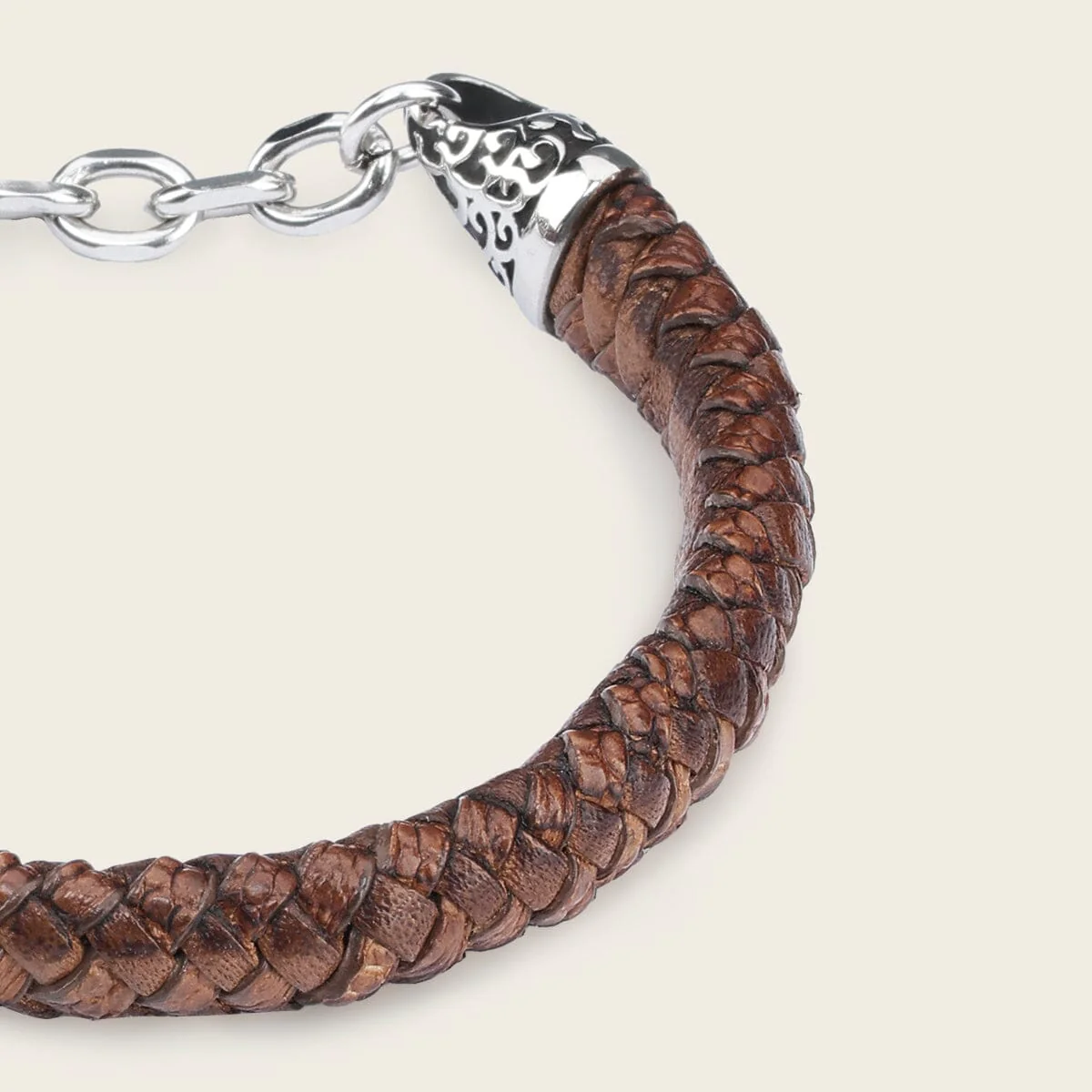 Pulsera para caballero en piel de bovino y piel genuina de lizard trenzada. Presenta aplicaciones en acero inoxidable y componente Cuadra con acabado platino. Diámetro aproximado de 6.3 cm.