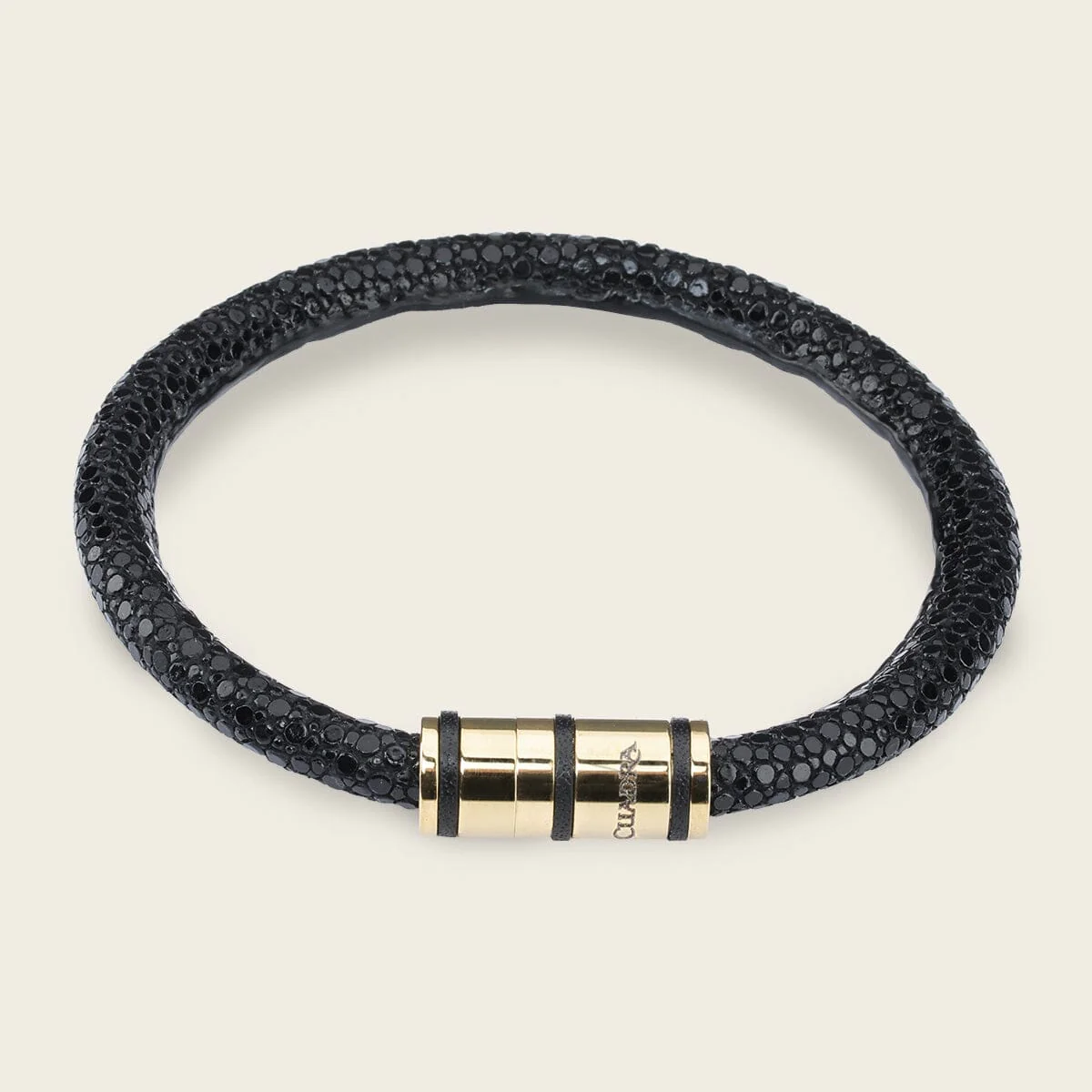 Pulsera para caballero en piel genuina de mantarraya y aplicación en piel de bovino. Con aplicaciones en colores contrastantes. Con broche imán de acero inoxidable. Diámetro aproximado de 6.3 cm