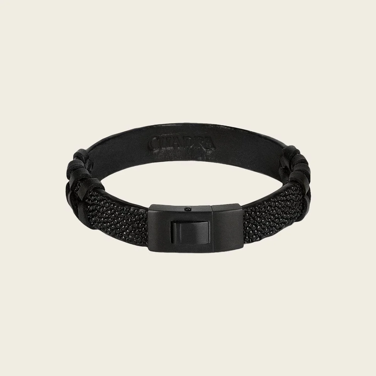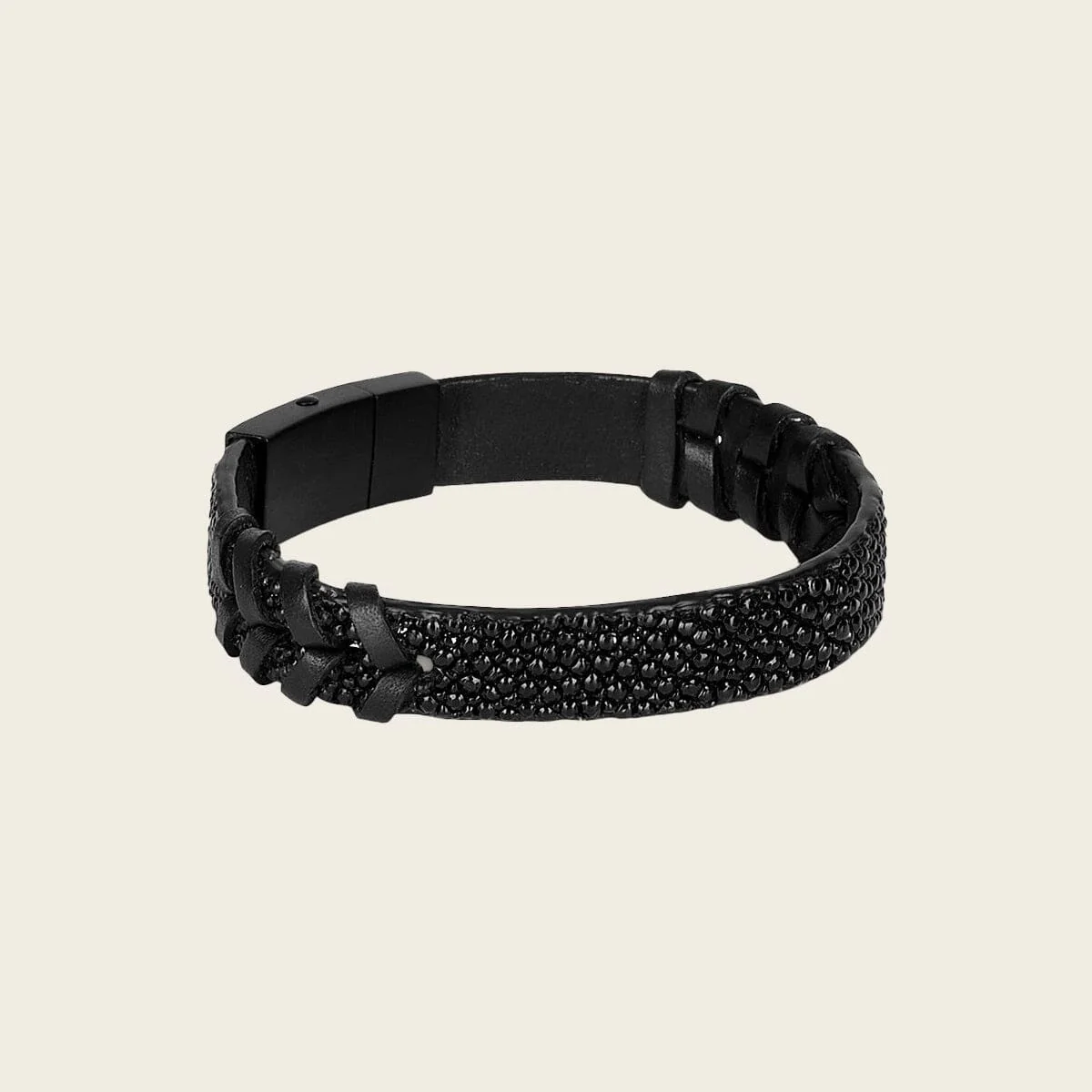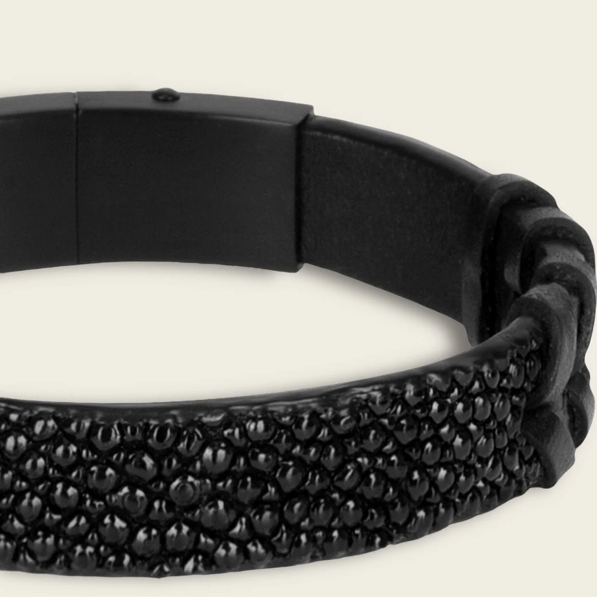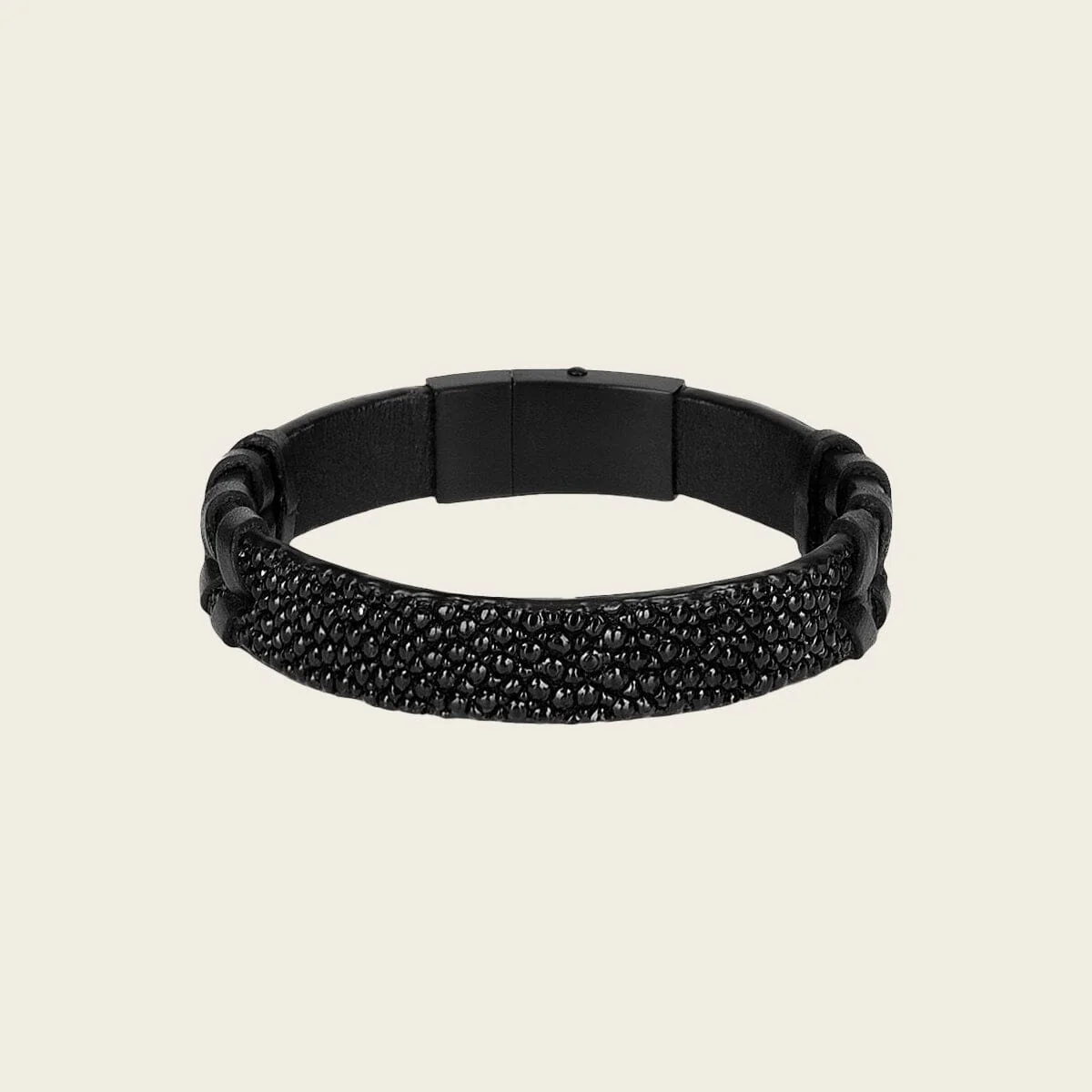Pulsera para caballero en piel genuina de mantarraya con detalles de tejido artesanal en piel de bovino. Ajustado con broche de acero inoxidable en acabado negro mate. Diámetro: 6.4 cm aproximadamente.