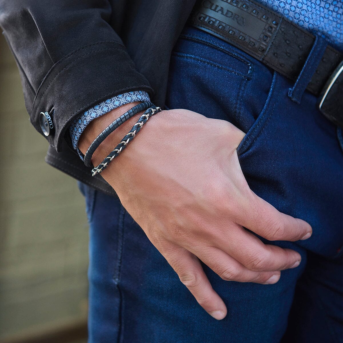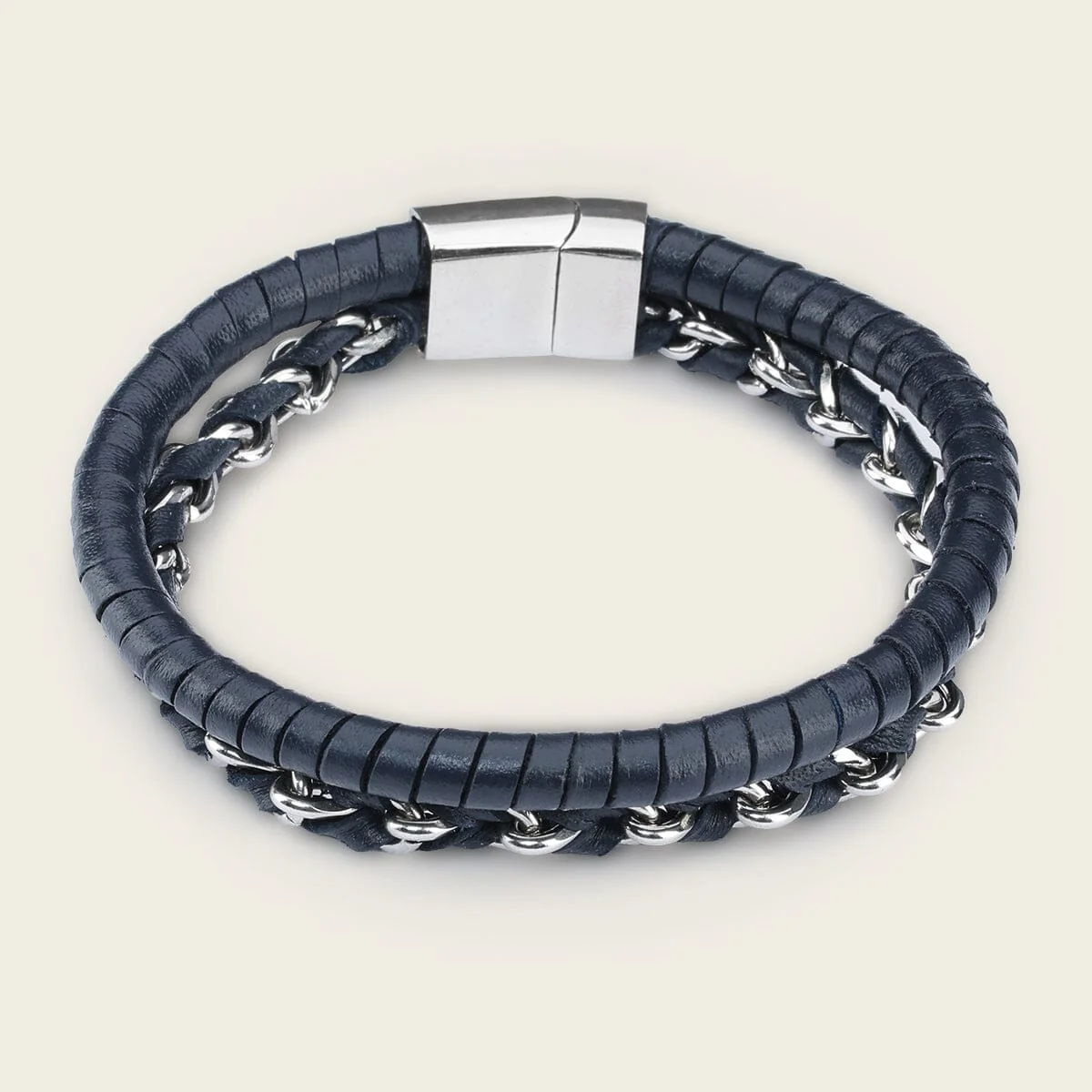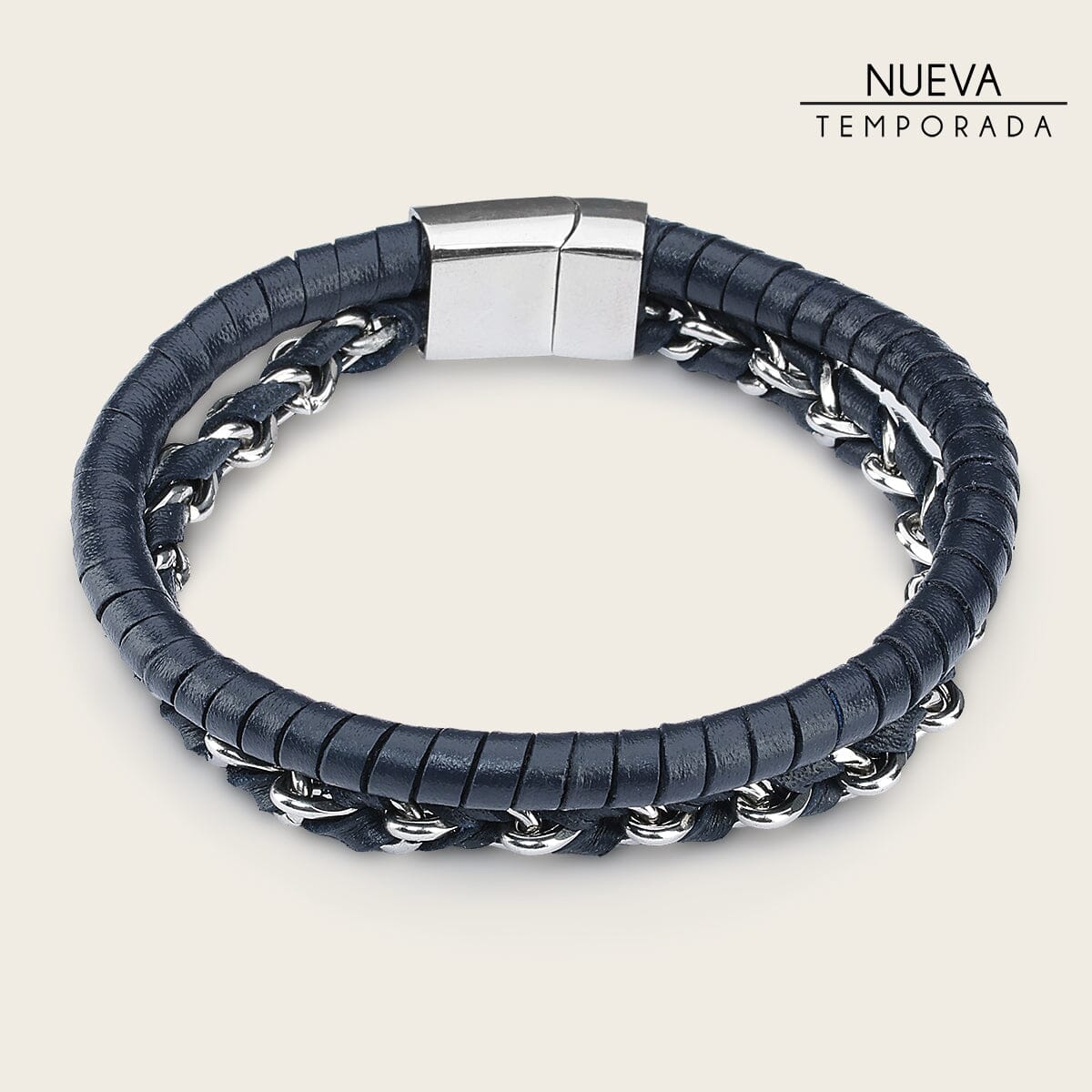 Pulsera doble para caballero en piel de bovino. Entretejida sobre cadena. Con broche imán de acero inoxidable y cadena en acabado platino. Diámetro aproximado de 6.3 cm