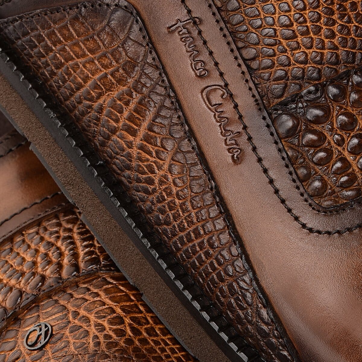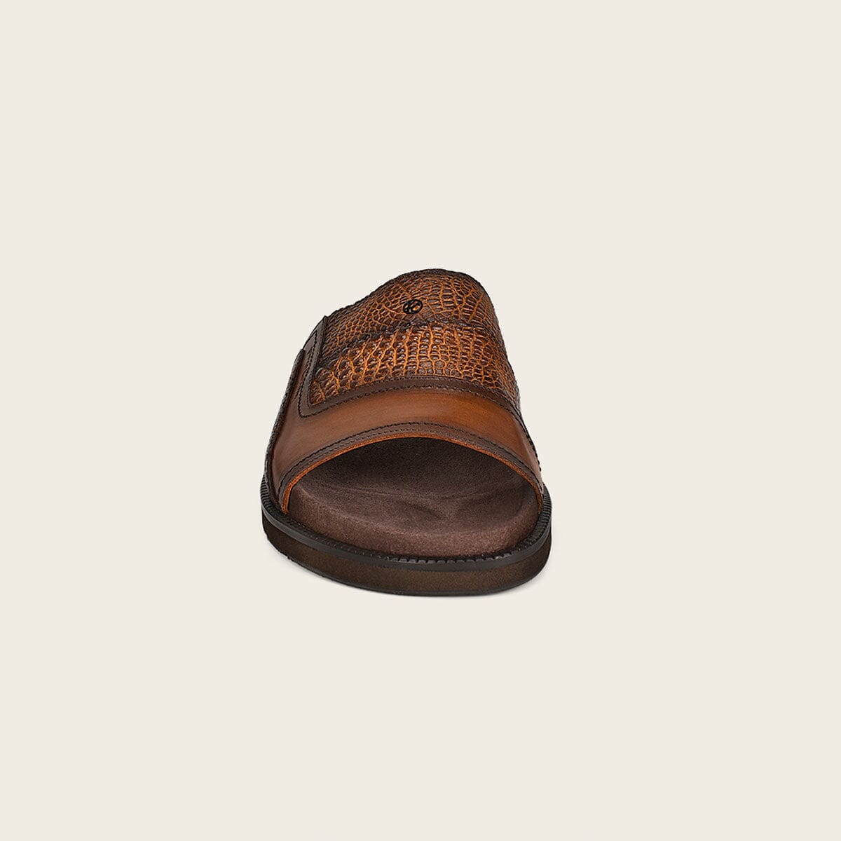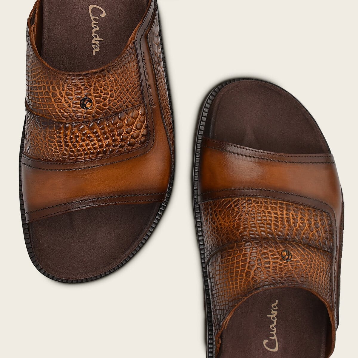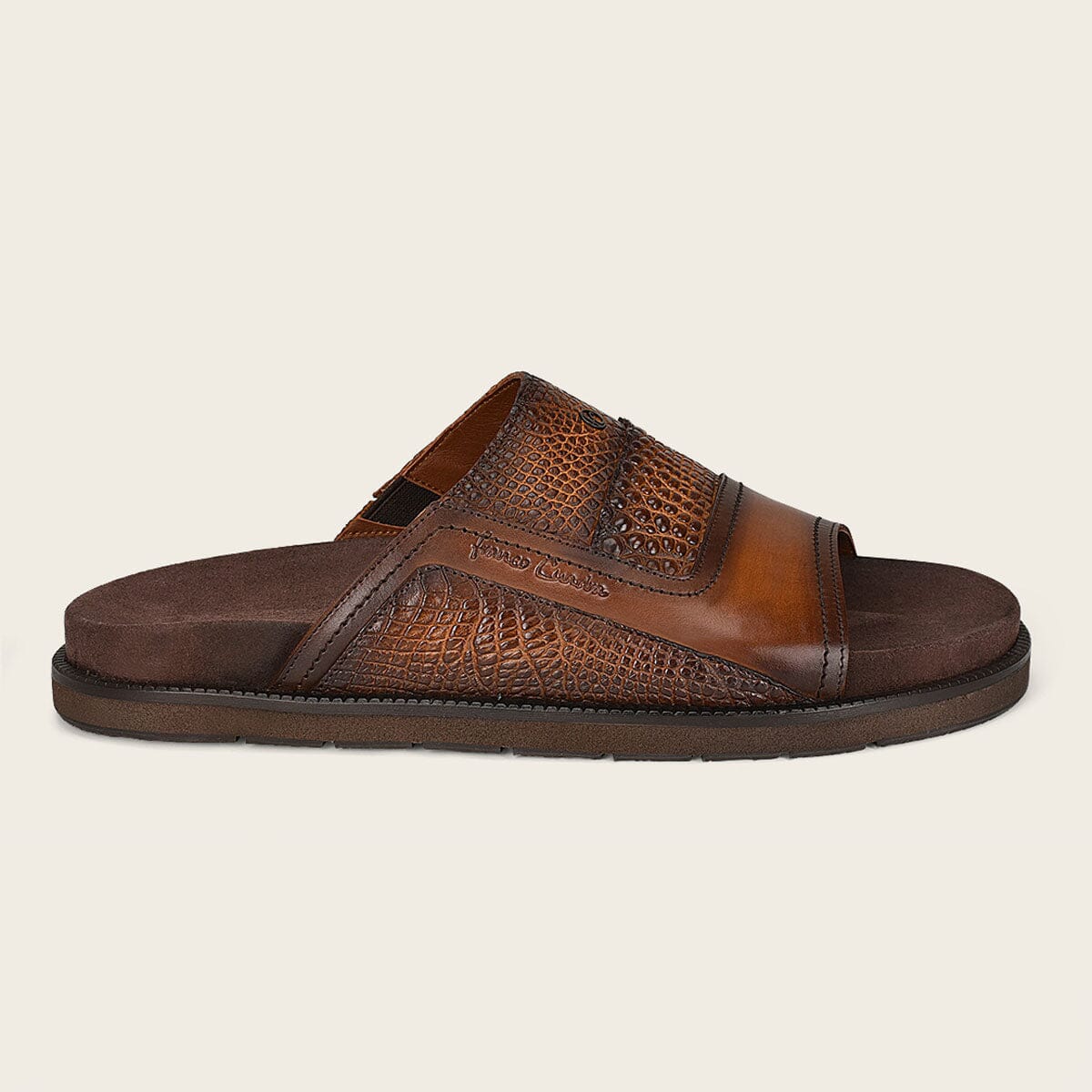 Sandalia para caballero en piel genuina de alligator y piel de bovino. Presenta aplicación metálica de monograma Franco Cuadra al frente y sombreado pintado a mano. Con footbed ultrasuave forrado en textil antimicótico y transpirable. Con suela de EVA y hule.