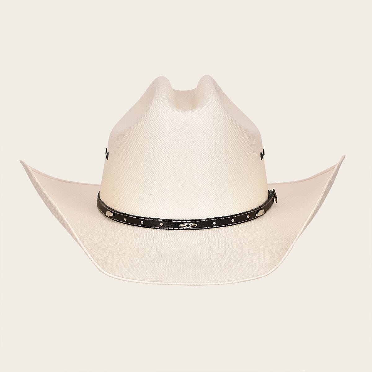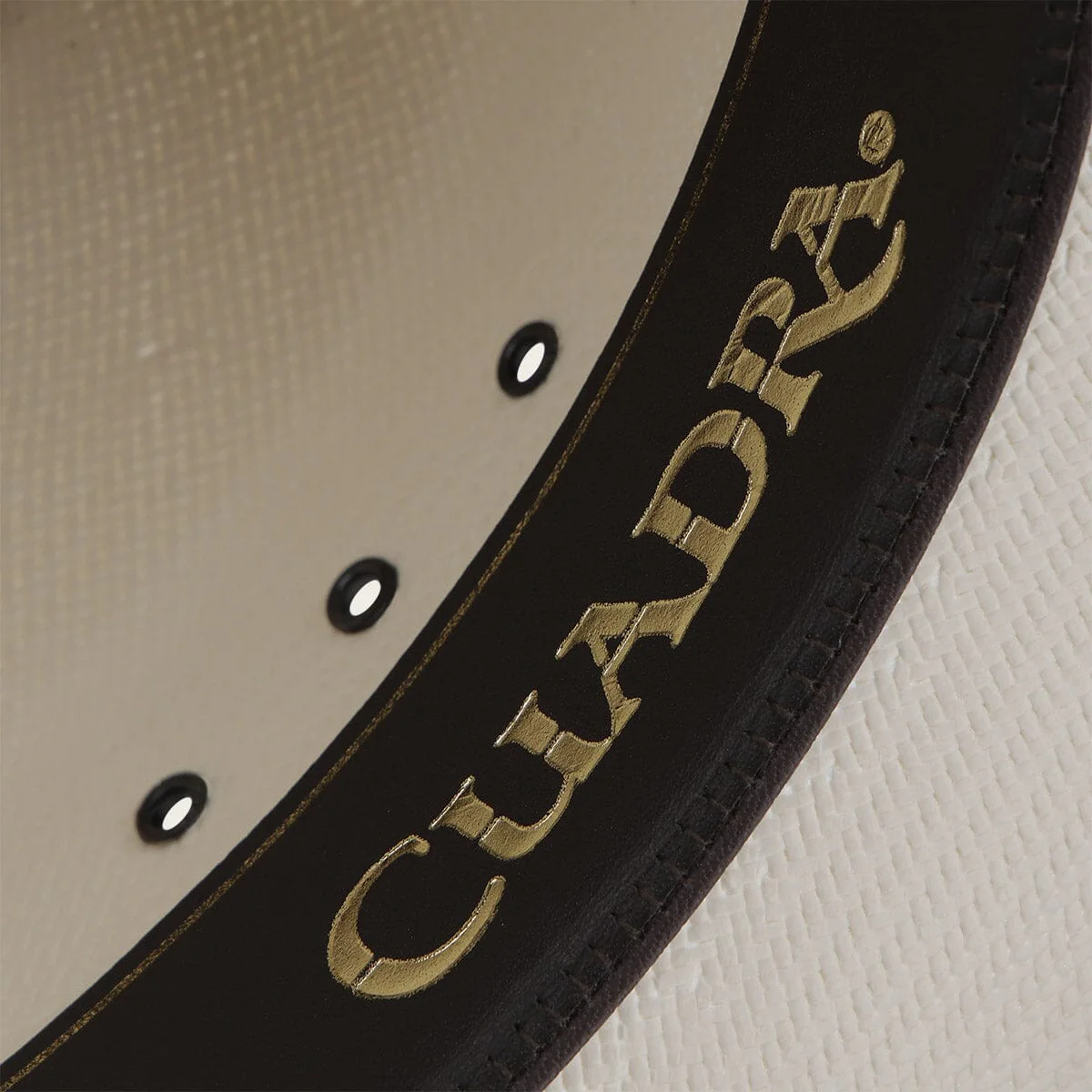 Sombrero Cuadra de paja tipo Shantung. Con cintillo en piel de bovino con estoperoles y aplicación metálica de monograma Cuadra.
