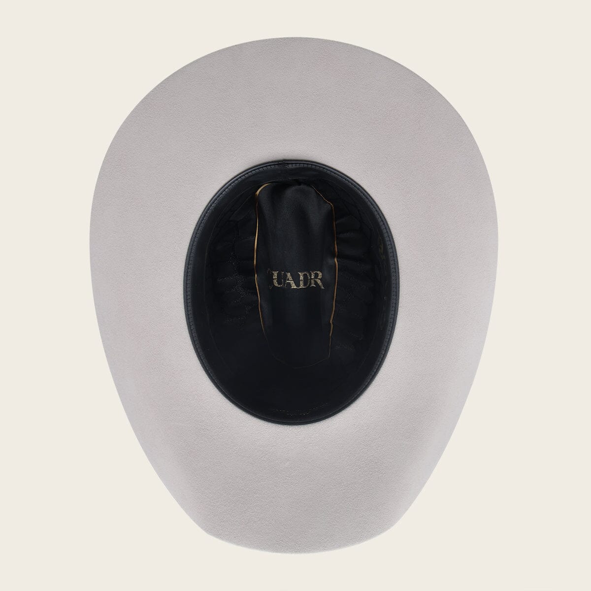 Sombrero en pelo de conejo. Presenta ala de 4 pulgadas, hebilla metálica en forma de caimán, toquilla en pelo de conejo. Con forro bordado con detalle de caimán y tafilete en piel de genuina de bovino.