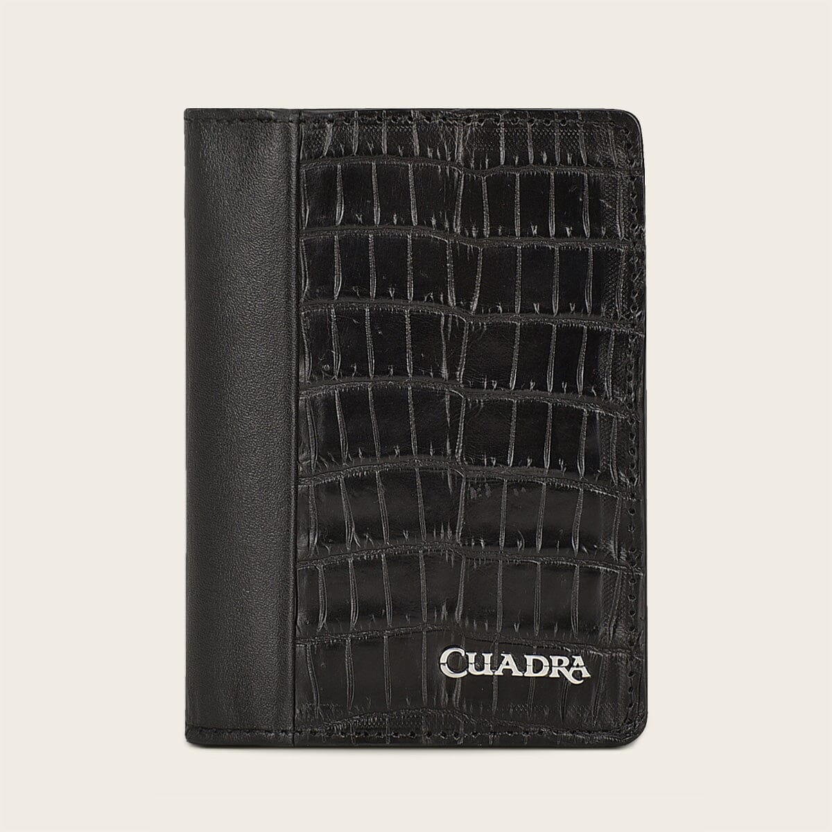 Tarjetero para caballero en piel genuina de fuscus y piel de bovino. Con aplicación metálica de logotipo Cuadra. Con un compartimento para tarjetas en la parte trasera. En su interior cuenta con ocho espacios para tarjetas. Asegurado con broche de presión. Color negro.