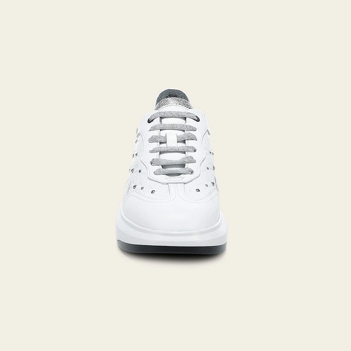 Tenis ultra ligeros para dama en piel genuina de bovino. Presenta aplicaciones de cristales auténticos sobre diseño grabado en alto relieve en motivos naturales. Ajustados con agujetas. Con suela bicolor de EVA, extra ligera y reconocida por su ligereza y confort.