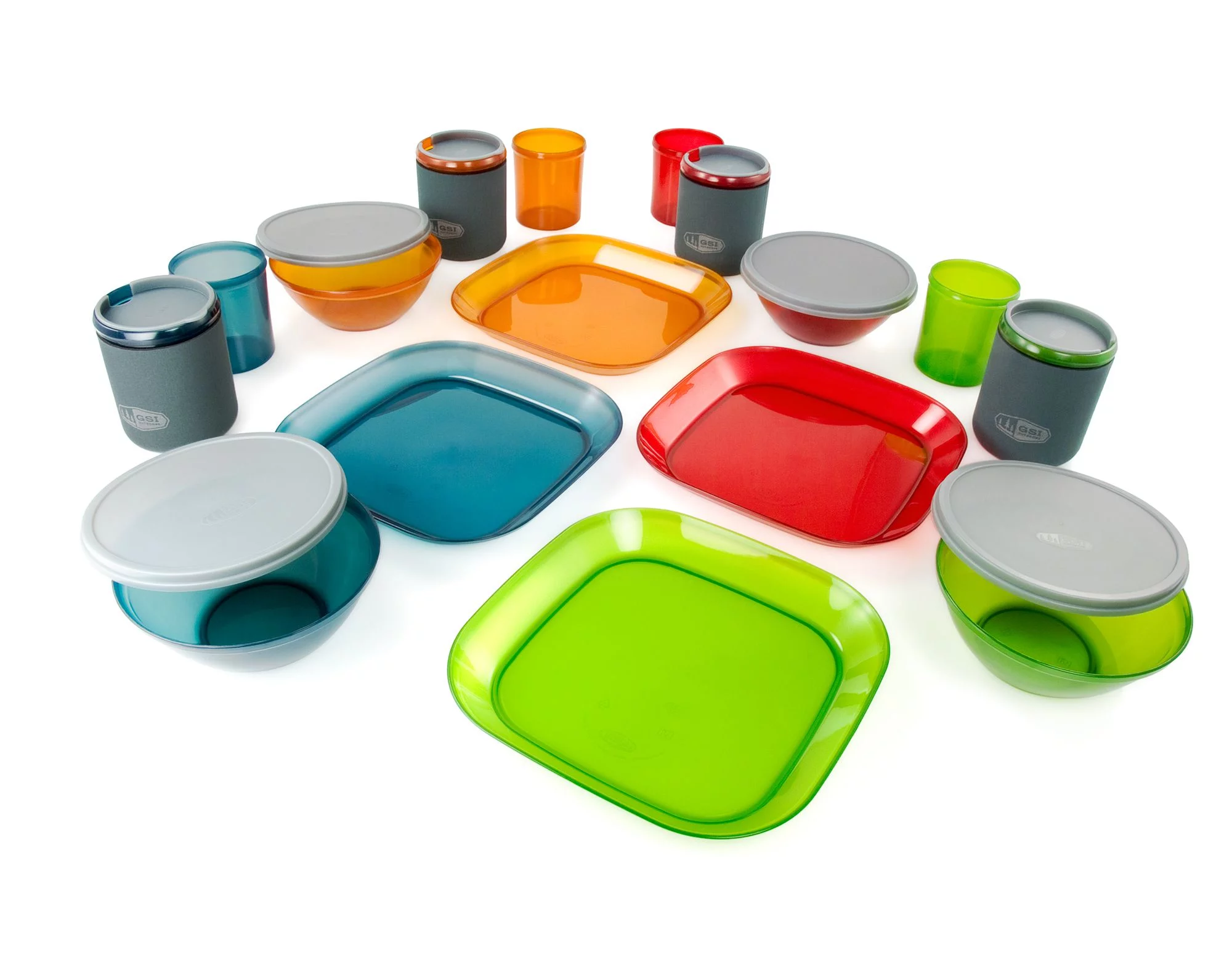 Completo sistema de vajilla para camping que incluye 4 cuencos con tapas, 4 tazas con aislamiento, 4 vasos para beber, 4 platos de tamaño completo y un saco de malla