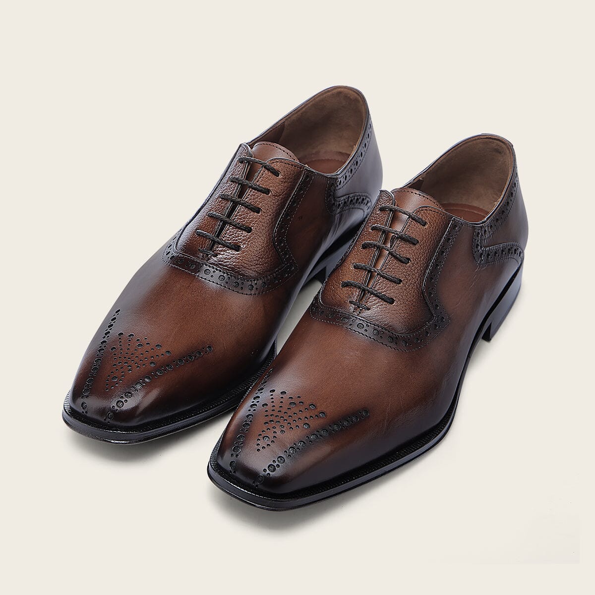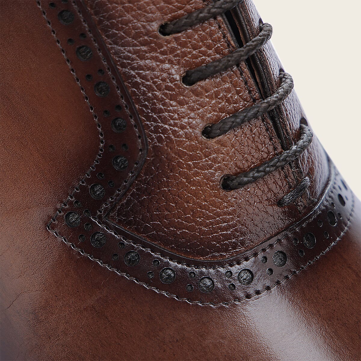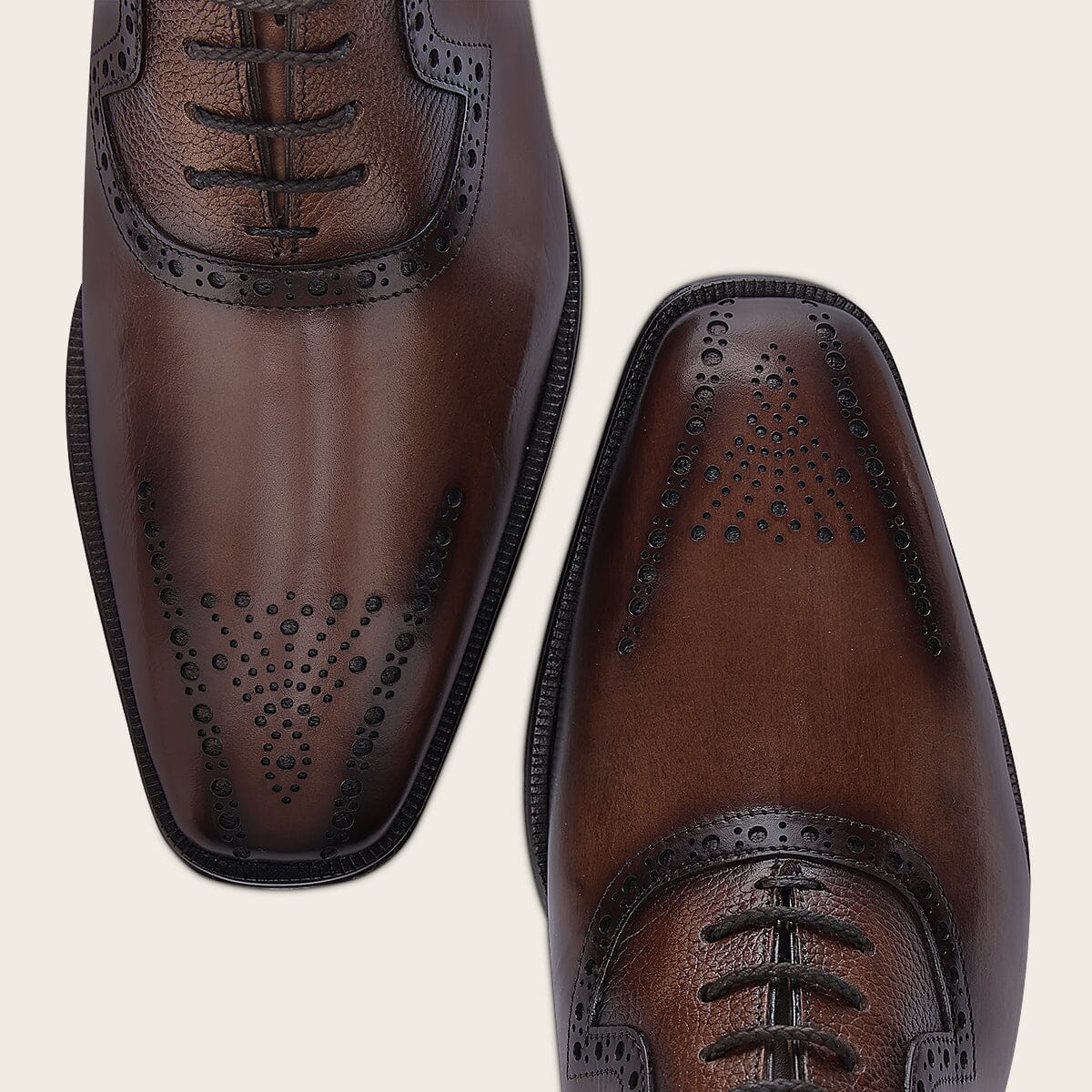 Zapato de vestir tipo Oxford para caballero en piel genuina de bovino. Con detalles de brocado y grabado. Ajustado con agujetas frontales. Con suela de cuero con injerto de TPU.