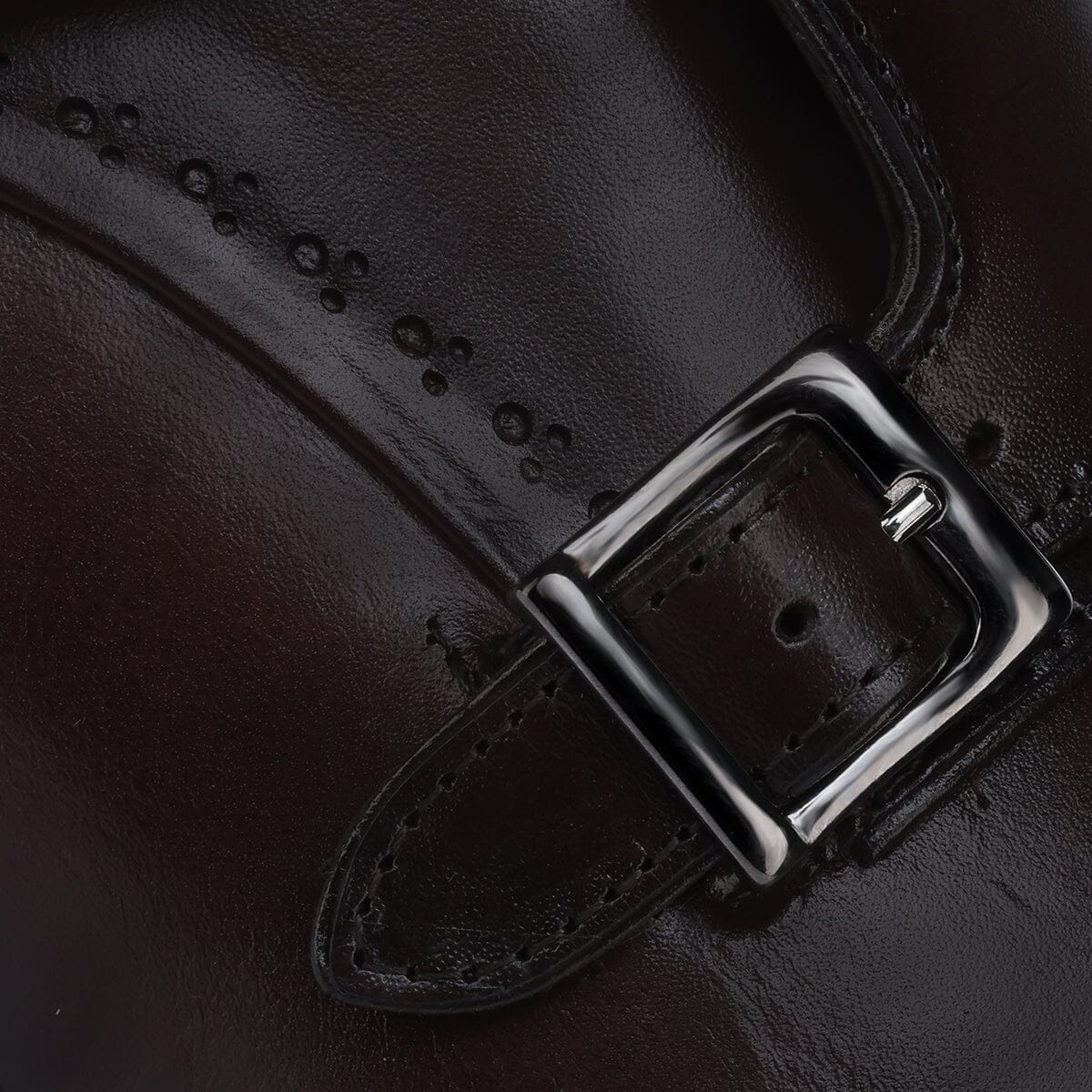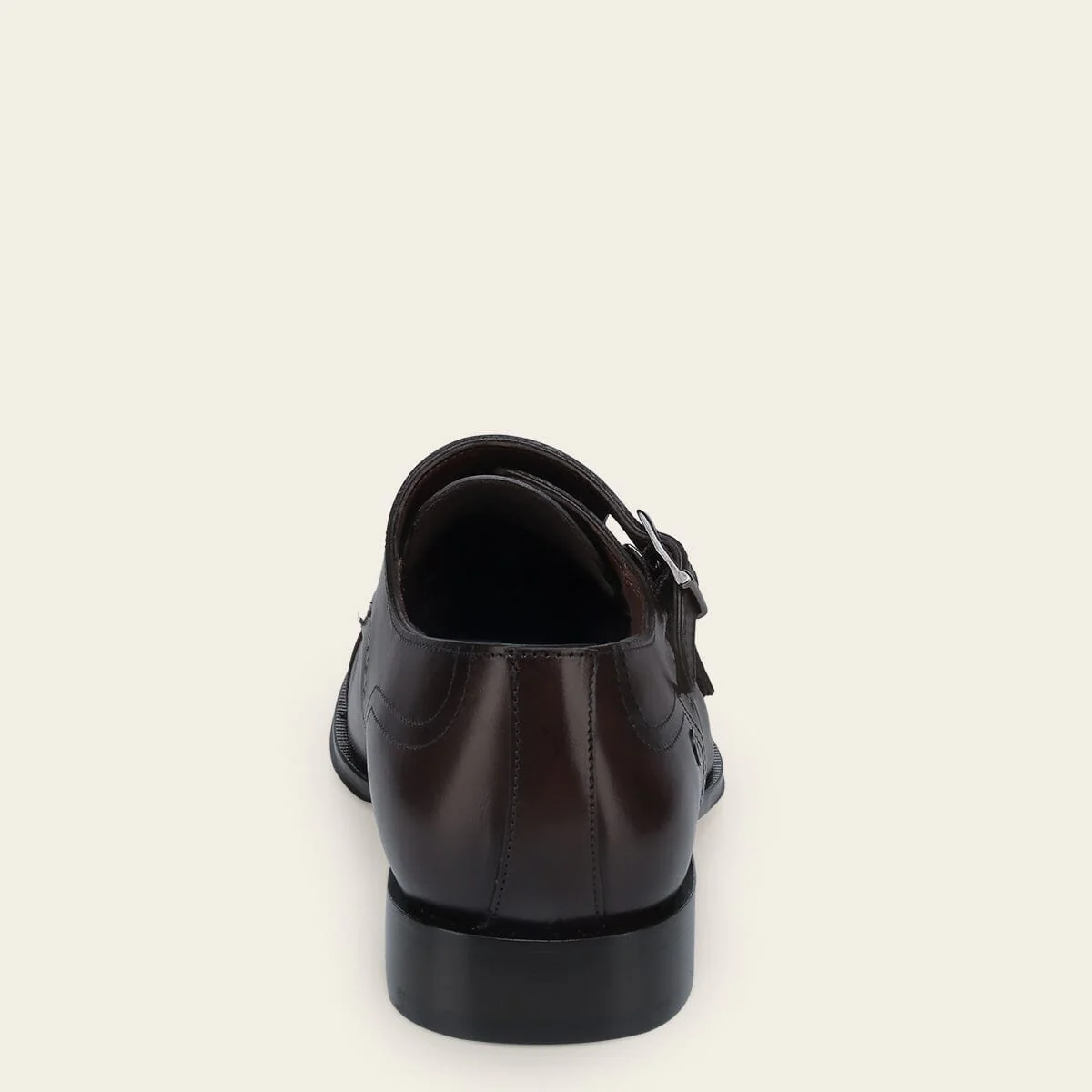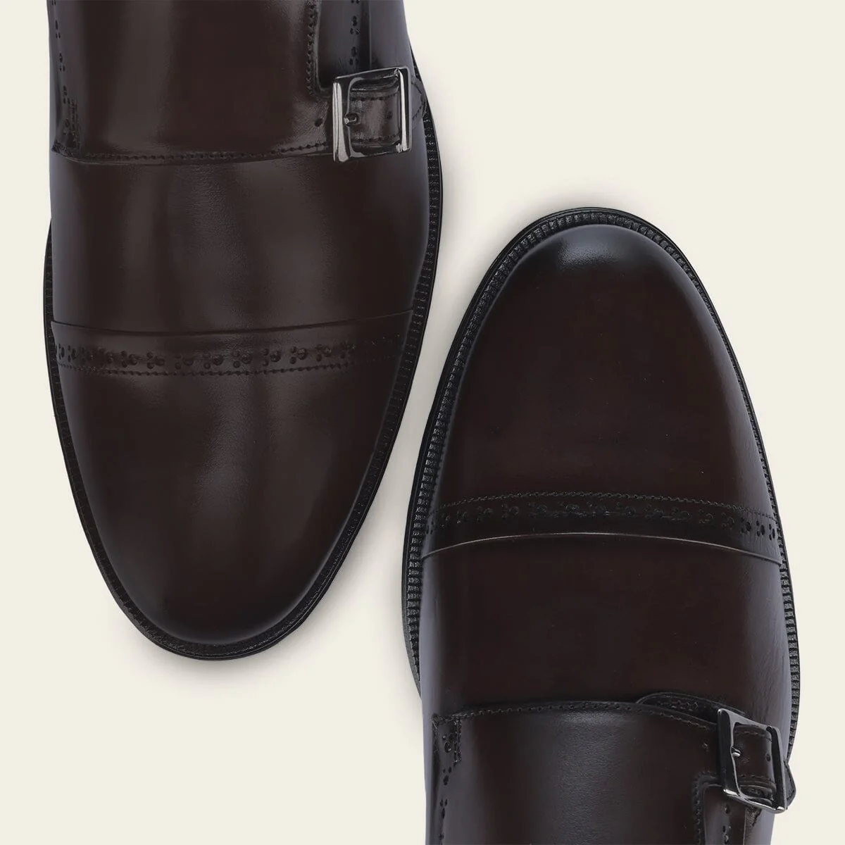 Zapato de vestir tipo monkstrap para caballero en piel genuina de bovino. Con detalles de brocado y grabado. Ajustado con correas frontales. Con suela de cuero con injerto de TPU.