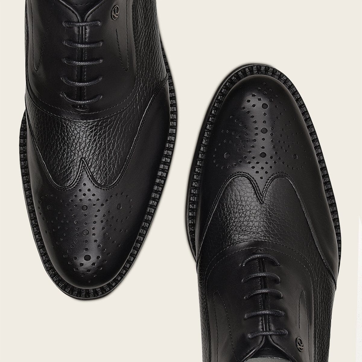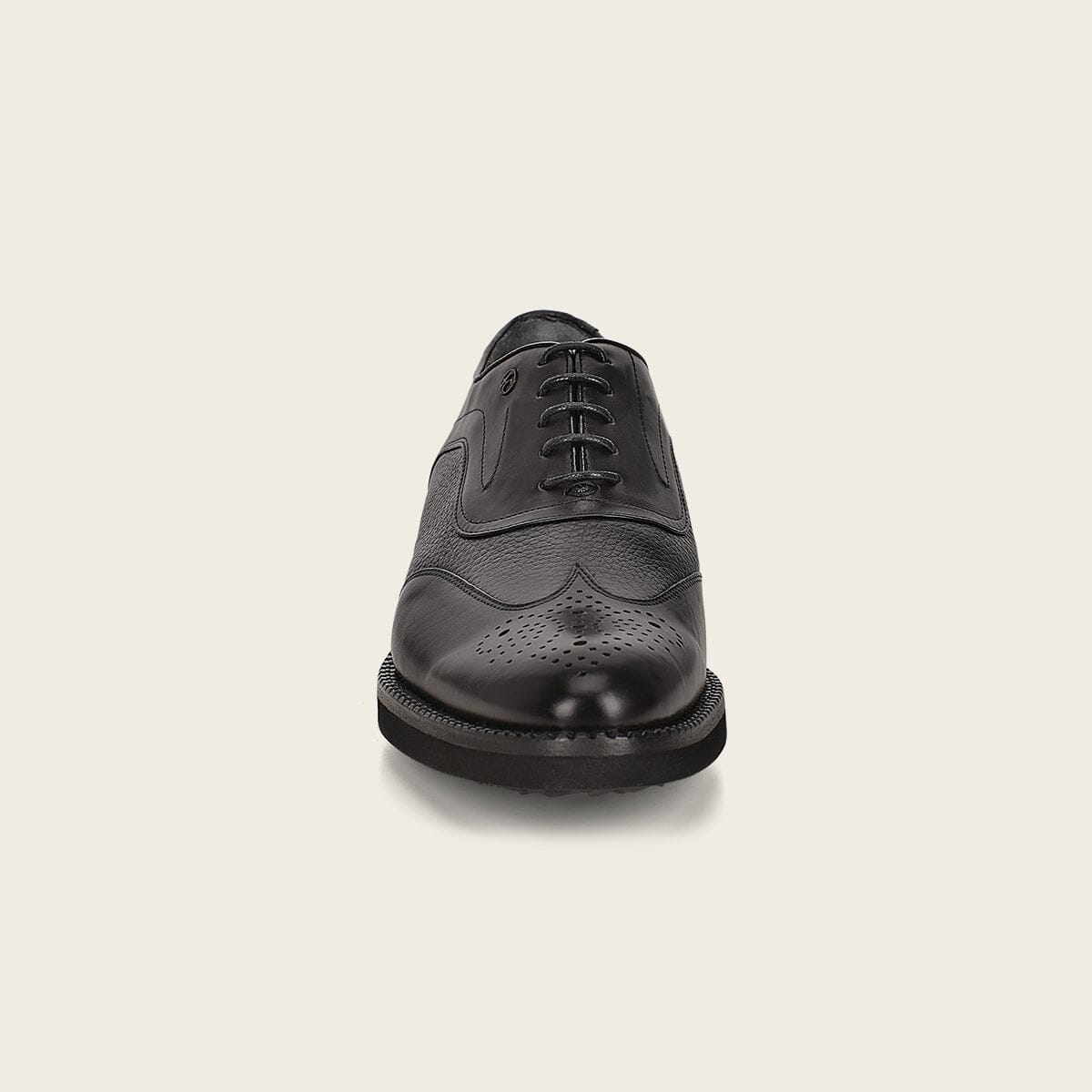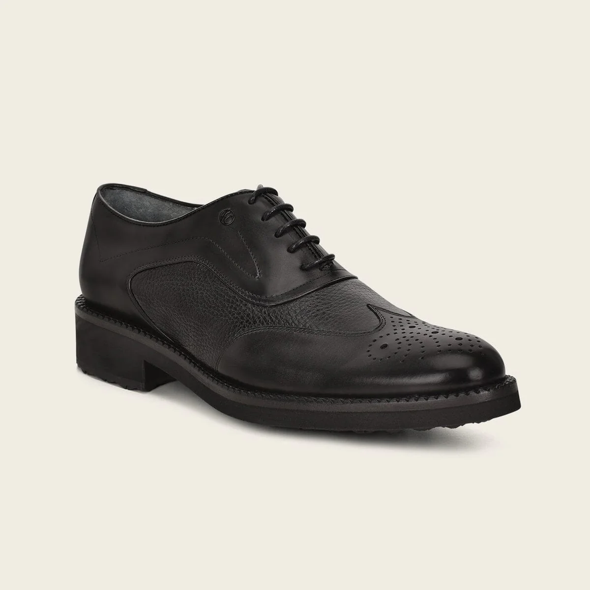 Zapato de vestir tipo Derby para caballero en piel genuina de venado y piel de bovino. Al frente presenta brocado en medallón y en un costado una aplicación metálica de monograma Franco Cuadra. Ajustados con agujetas al frente. Con suela de EVA con injerto de TPU.